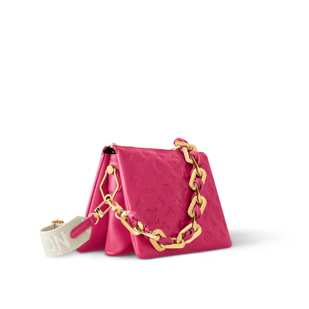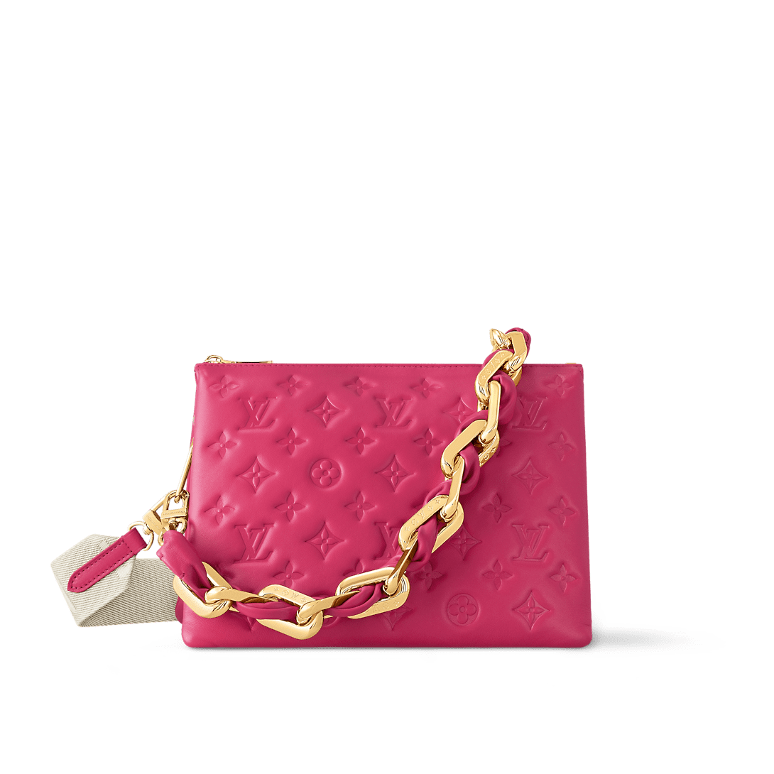 The Coussin PM handbag is made from puffy lambskin, embossed with the Monogram pattern. Lined with smooth cowhide, the inside of the bag is divided into two compartments by a zipped pocket. This body-friendly bag can be comfortably carried with its wide removable shoulder strap or with its leather braided chunky chain.