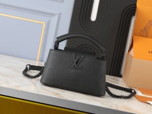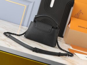 The Capucines Mini handbag is offered in a new east-west silhouette, a fashionable shape sized to hold a smartphone, compact wallet and other small essentials. It is crafted from luxurious Taurillon leather accented with matte hardware, for a modern attitude. Along with all the iconic Capucines signatures, this model features an adjustable braided chain for shoulder or cross-body styling.