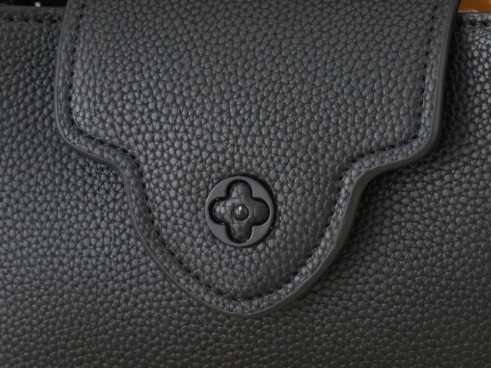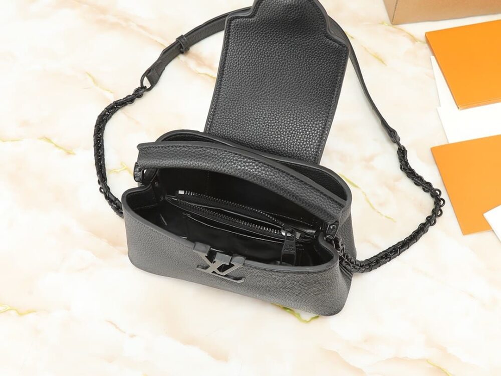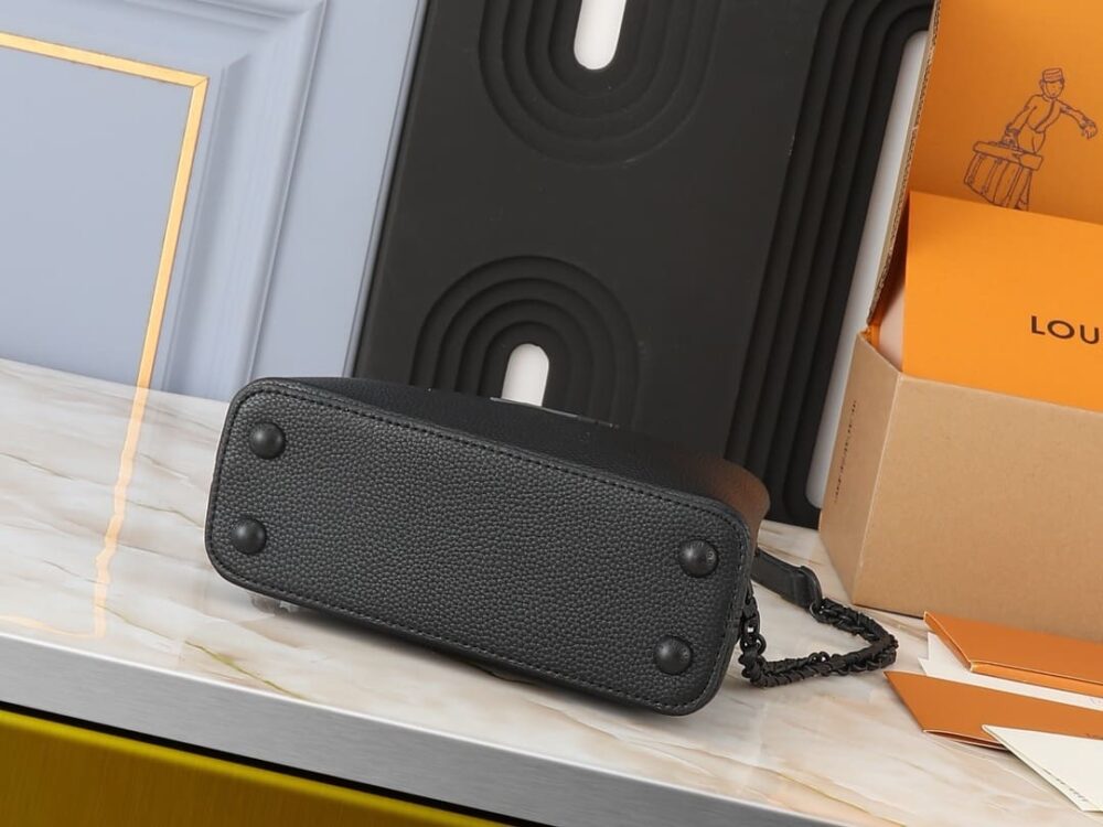 The Capucines Mini handbag is offered in a new east-west silhouette, a fashionable shape sized to hold a smartphone, compact wallet and other small essentials. It is crafted from luxurious Taurillon leather accented with matte hardware, for a modern attitude. Along with all the iconic Capucines signatures, this model features an adjustable braided chain for shoulder or cross-body styling.