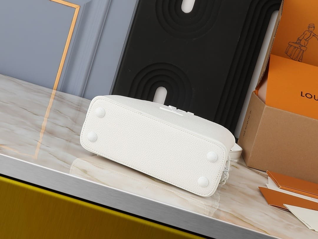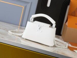 The Capucines Mini handbag is offered in a new east-west silhouette, a fashionable shape sized to hold a smartphone, compact wallet and other small essentials. It is crafted from luxurious Taurillon leather accented with matte hardware, for a modern attitude. Along with all the iconic Capucines signatures, this model features an adjustable braided chain for shoulder or cross-body styling.
