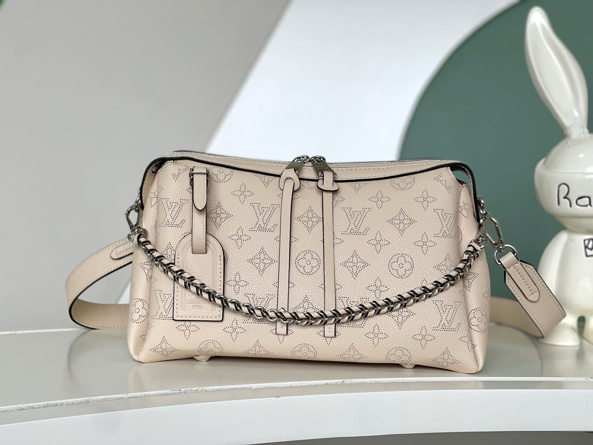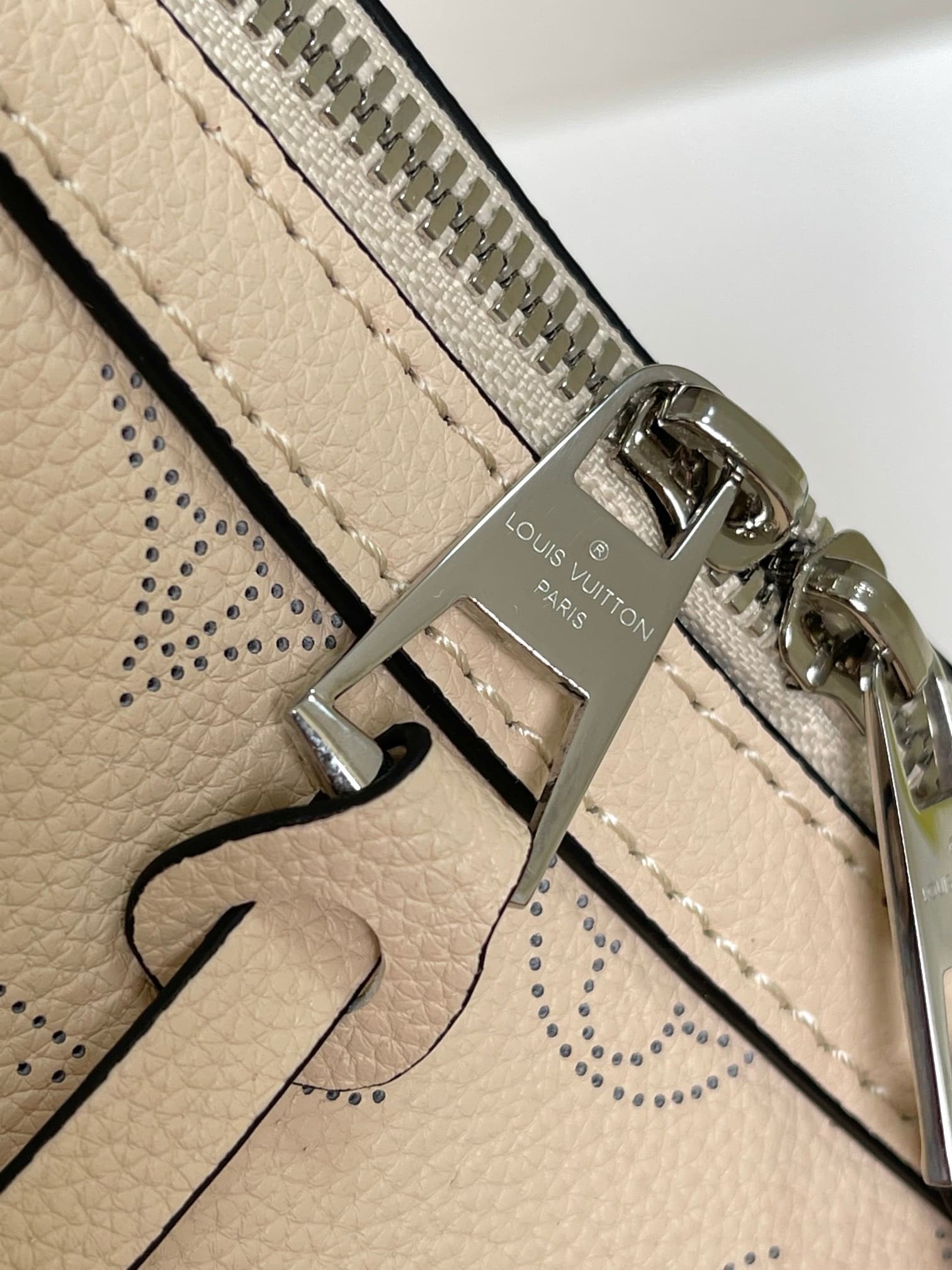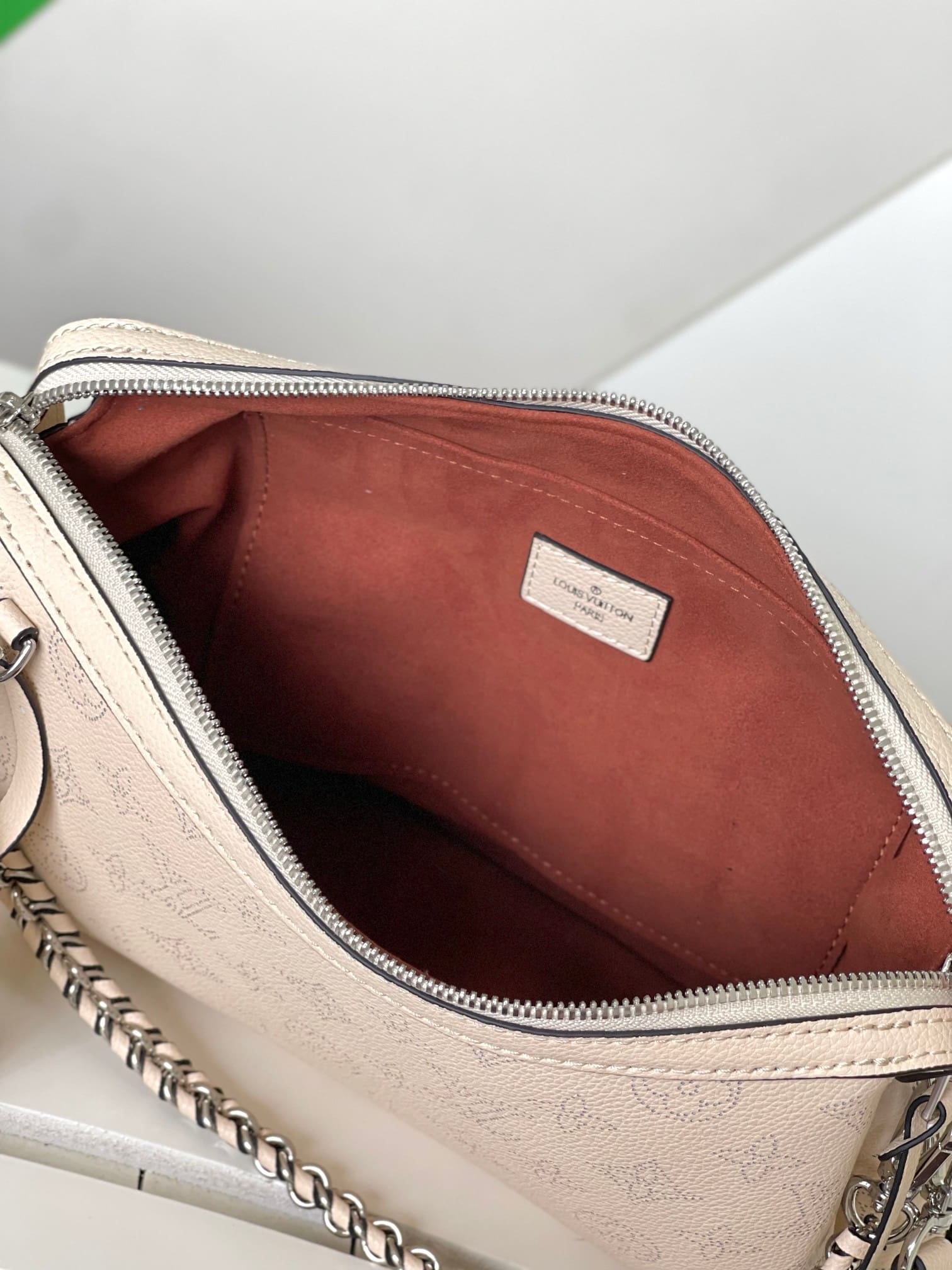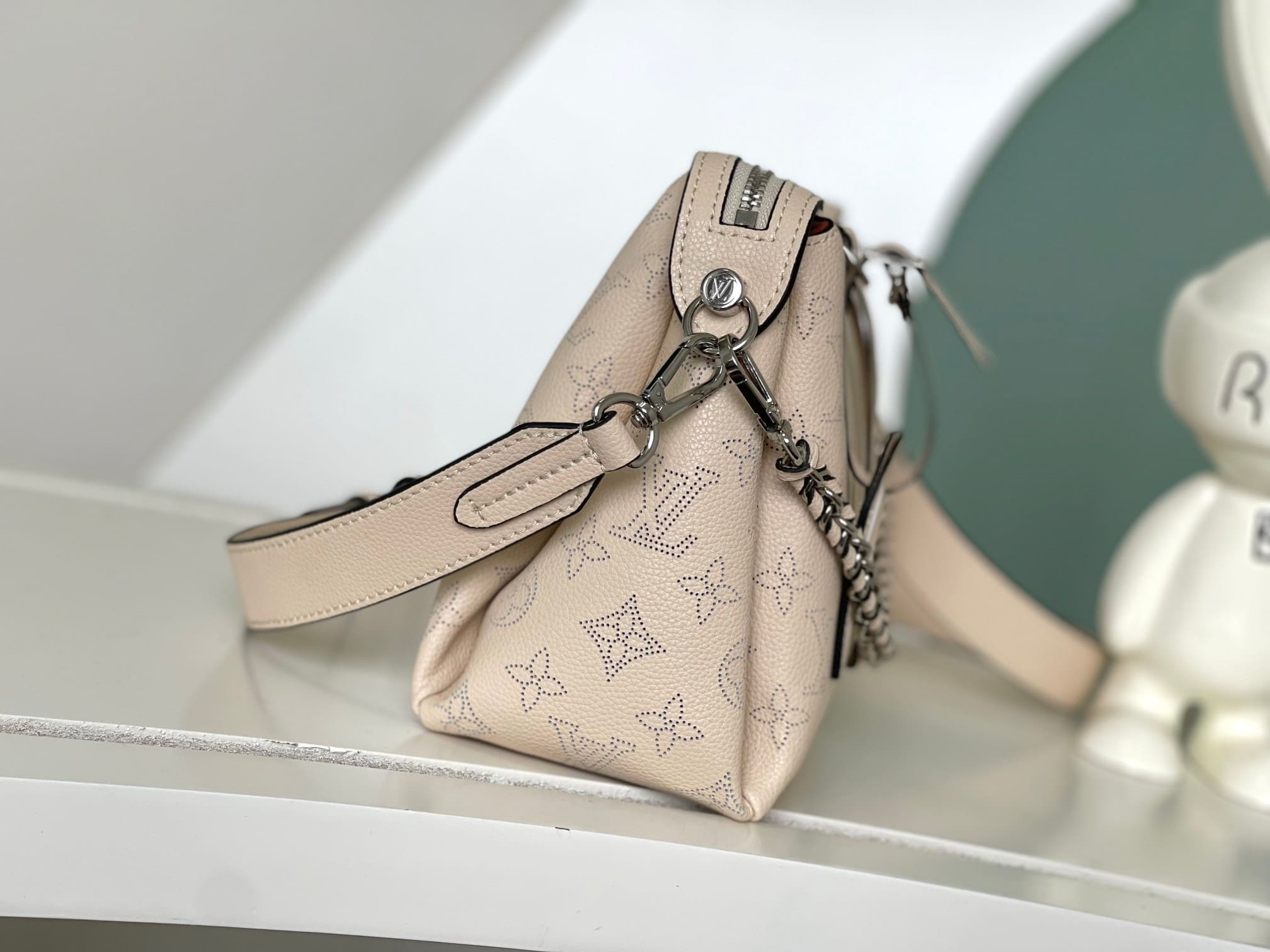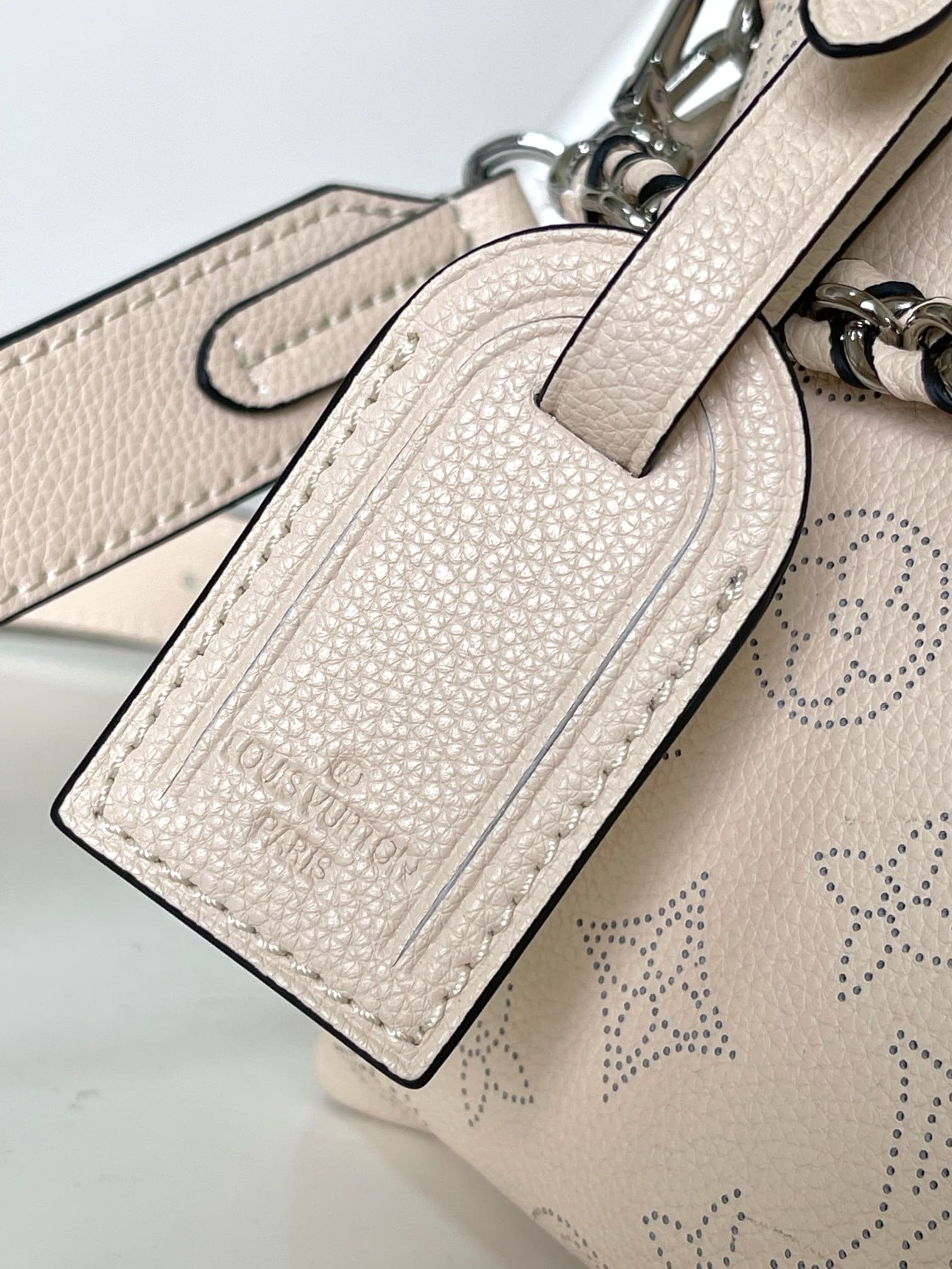 This small Mahina Hand It All bag is made of fine perforated cowhide leather, with an elegant draped texture that highlights the chic silhouette. The leather shoulder strap and chain and leather braided handles are both detachable, providing a trendy choice for daily travel.