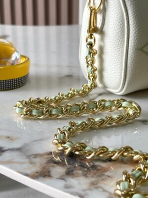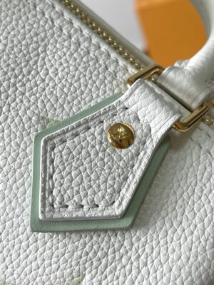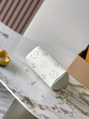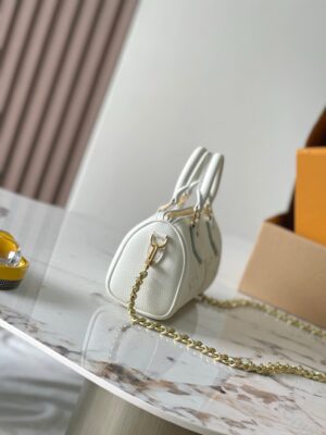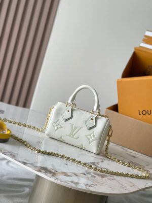 The Nano Speedy bag is revisited in supple, grained Monogram Empreinte leather in a fresh, bicolor palette that highlights the embossed Monogram pattern. This mini replica of the iconic Speedy comes with two handles and a removable, gold-tone chain, which is interlaced with leather, offering a refined look and different carry options.
