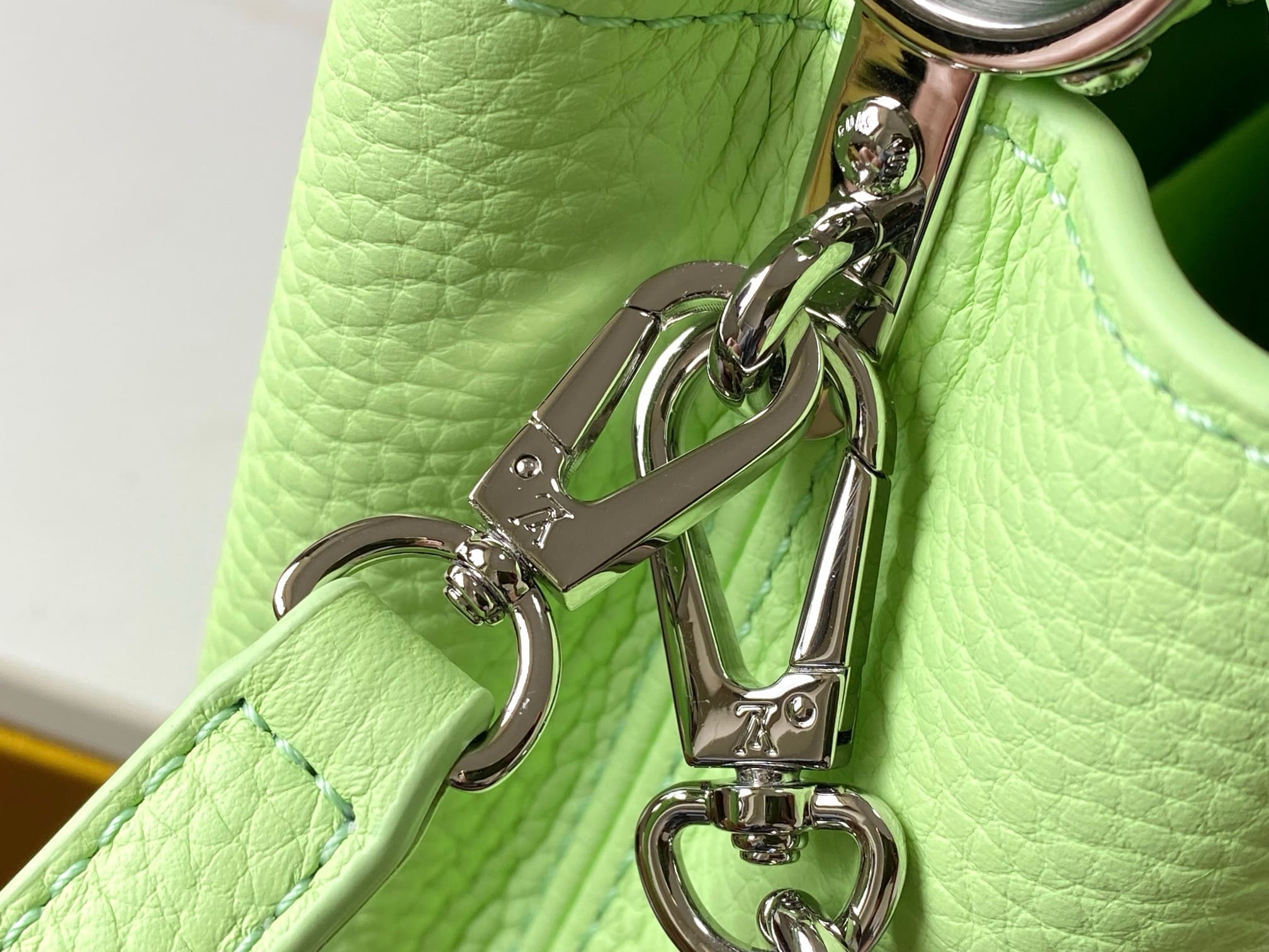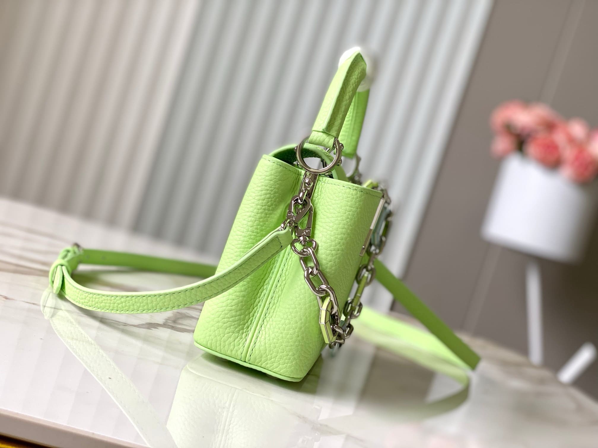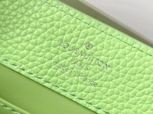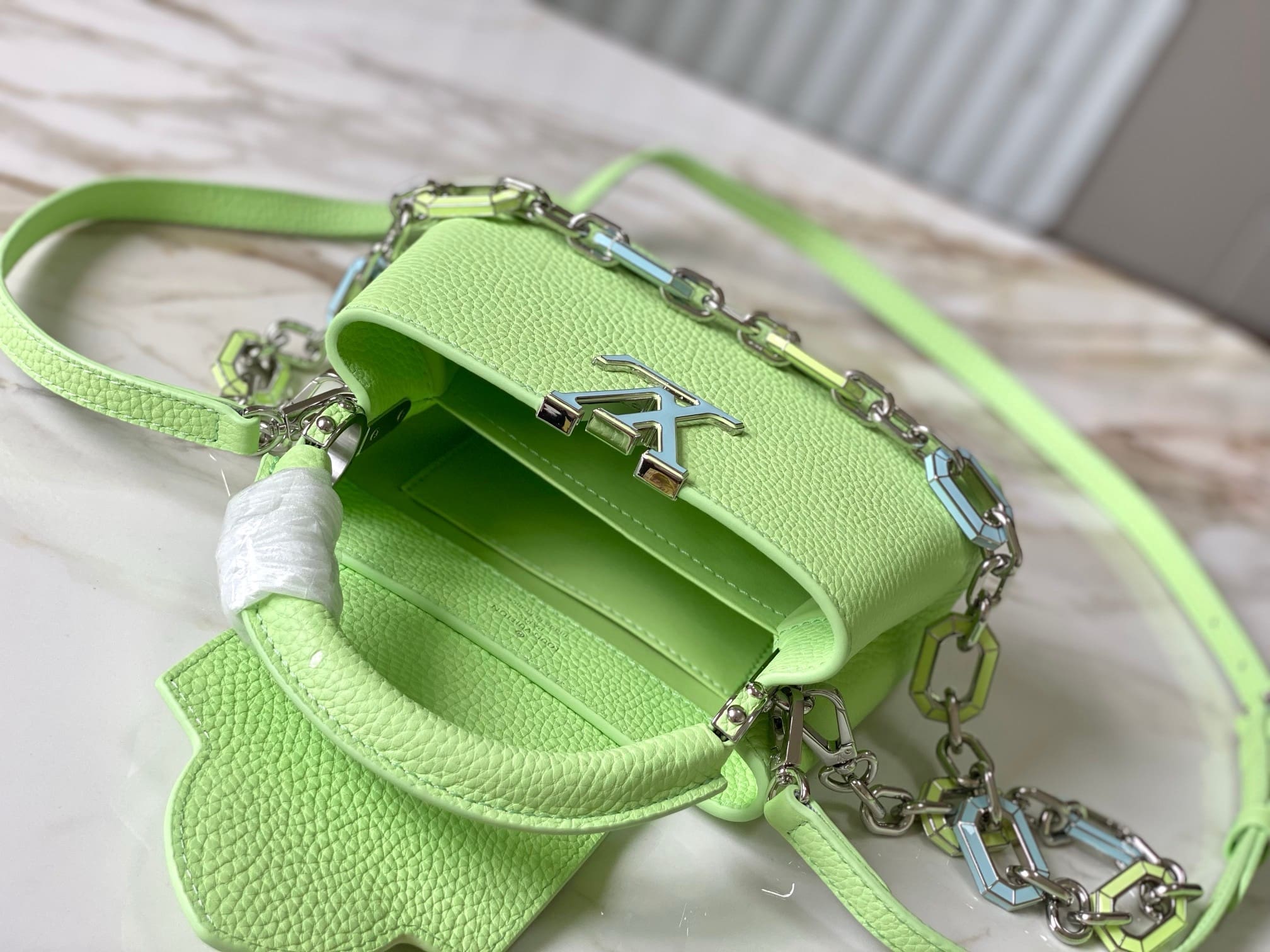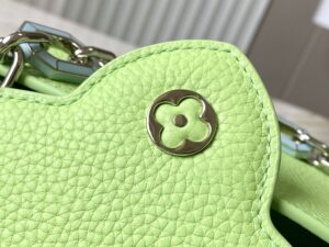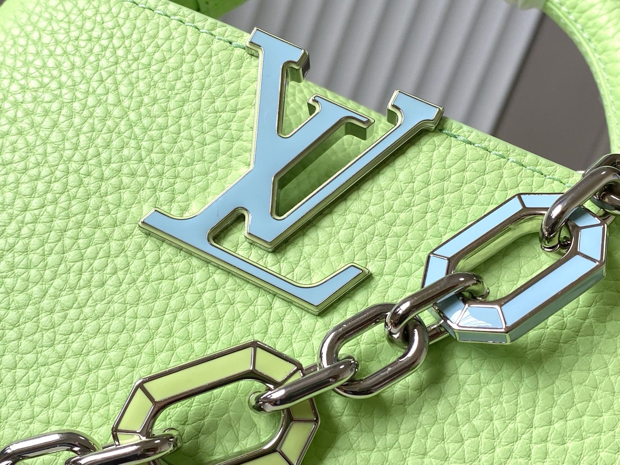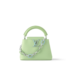 This Capucines Mini handbag in a tangy-colored Taurillon leather features a joyfully arty enameled chain. The luminous chain is made of octagonal links, evocative of Art Deco design, and adorned with colored enamel, carefully inlaid by hand. The bag’s signature LV Initials are rendered in 3D.