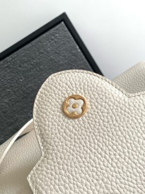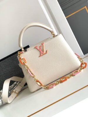 The Capucines BB bag is crafted from grained Taurillon leather and features a delicate chain with octagonal links inlaid with elegant enamel for a jewellery-like feel. Its compact shape can accommodate a smartphone, a long wallet and other small items.