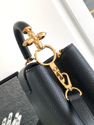 This adorable Capucines BB handbag is fashioned from Taurillon leather with gold-color hardware and signed with LV Initials in 3D. The rolled-leather top handle is completed by a superb golden Monogram Blossom in metal, testament to the House’s superior craftsmanship. There’s a removable and adjustable leather strap for shoulder wear.