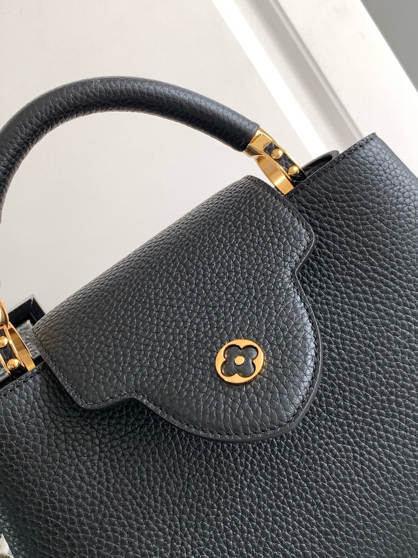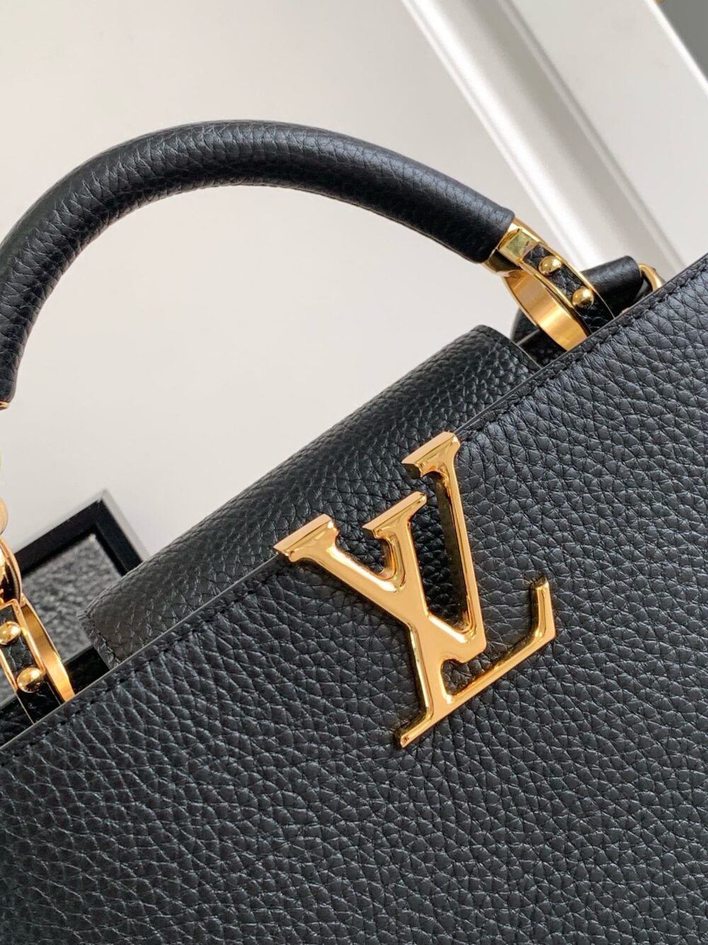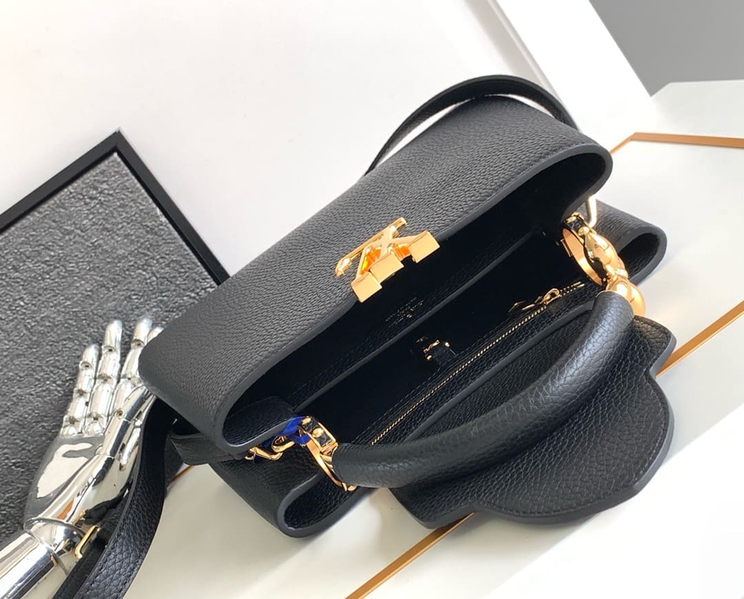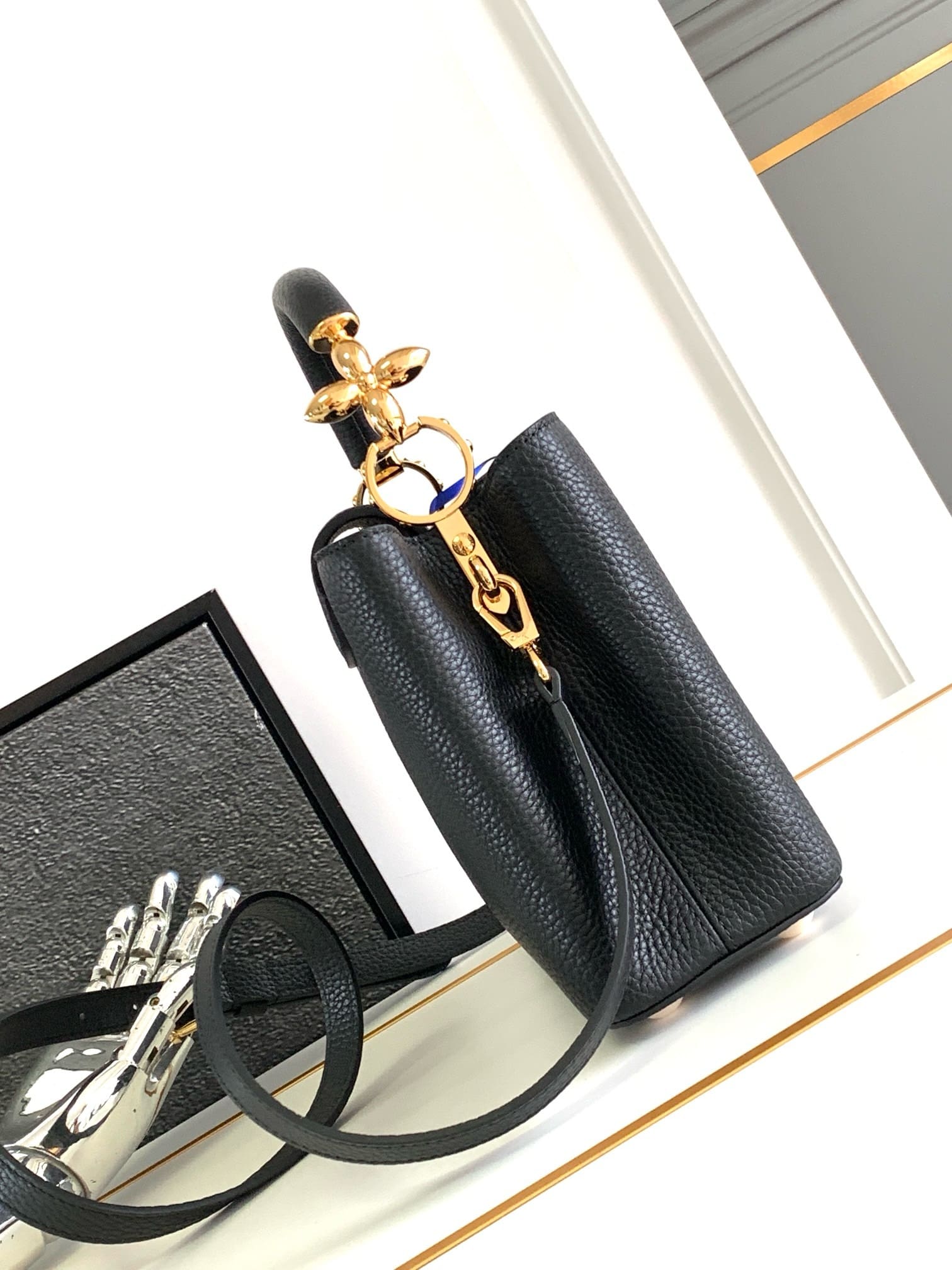 This adorable Capucines BB handbag is fashioned from Taurillon leather with gold-color hardware and signed with LV Initials in 3D. The rolled-leather top handle is completed by a superb golden Monogram Blossom in metal, testament to the House’s superior craftsmanship. There’s a removable and adjustable leather strap for shoulder wear.