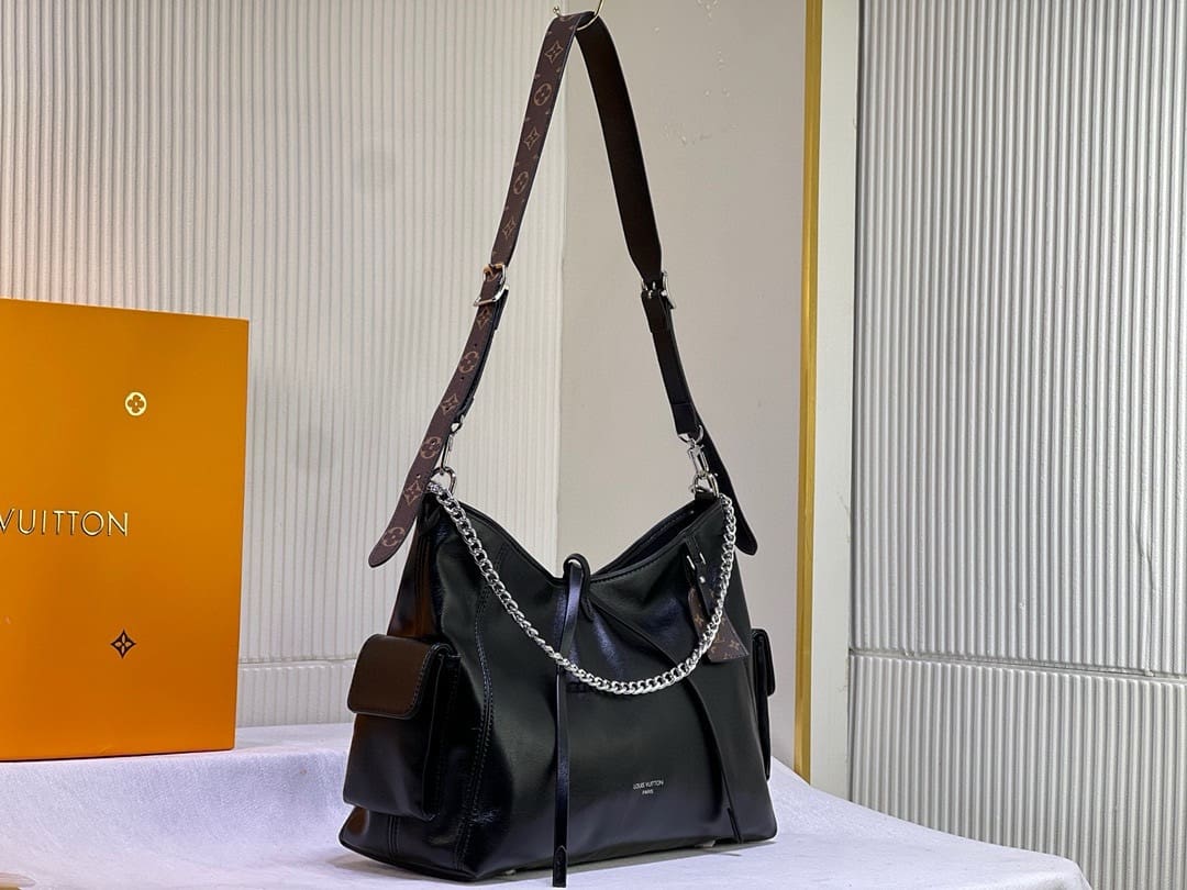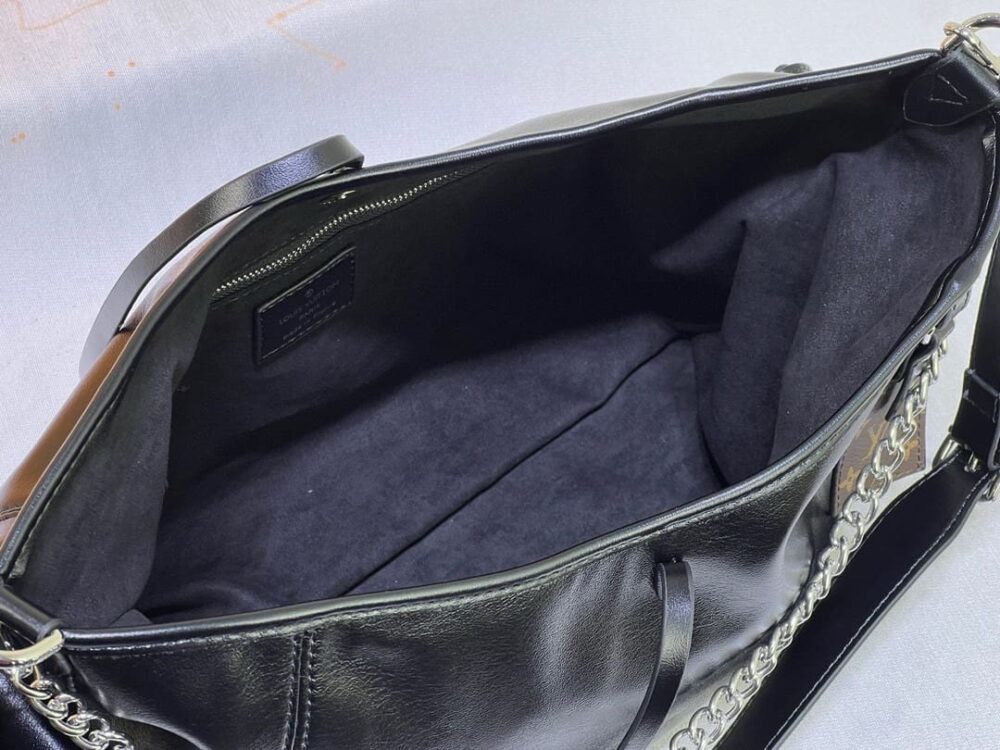 With its dark allure and slouchy silhouette, the CarryAll Cargo PM handbag is crafted from ultra-soft lambskin with a cool, slightly “rumpled” aspect and is accented with polished palladium-finish hardware. This day-to-evening piece offers great styling potential, thanks to a removable strap and a chic, detachable chain.