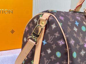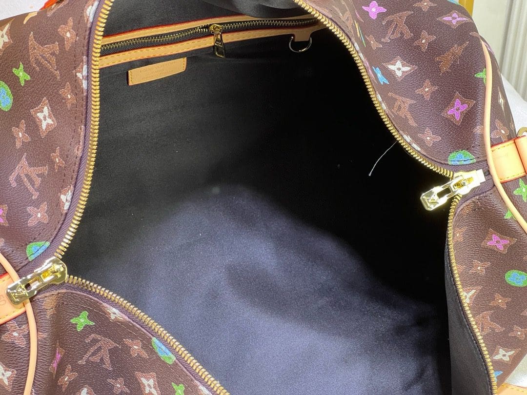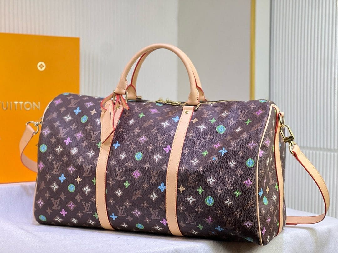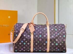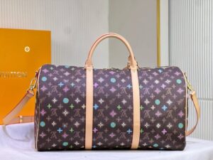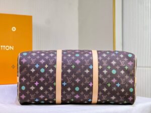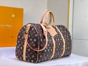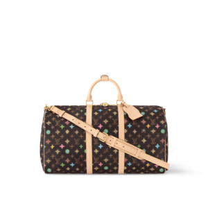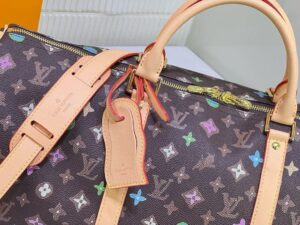 The Keepall Bandoulière 50 travel bag gets a makeover in colorful Monogram Craggy canvas. Reinterpreted by Tyler, the Monogram pattern is drawn by hand and includes daisies and terriers. The top handles, side bands, and removable shoulder strap are all in cowhide leather, as is the playful detachable wavy name tag.