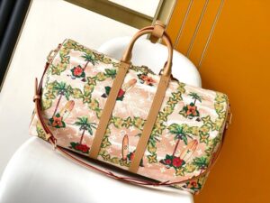 The classic Keepall Bandoulière 50 travel bag is eye-catching in Pharrell Williams’ Monogram Surfin’ coated canvas. The elaborate print juxtaposes vintage-style tropical motifs with classic House patterns like the Monogram Flowers. The Keepall is trimmed with natural cowhide-leather to give the bag a vintage feel.