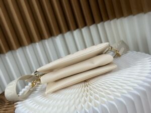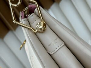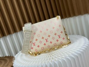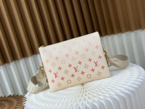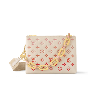 This Coussin PM handbag is made from Monogram Empreinte leather, with a Monogram print that seems to have been painted on the leather in watercolor. The touches of orange, pink and fuchsia bring an optimistic feel to the bag. There’s a removable chain with colorful plexiglass links and a removable strap for shoulder or cross-body carry.