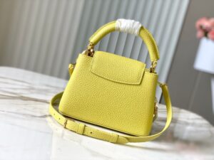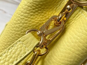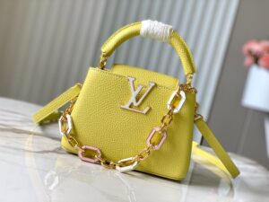 This Capucines Mini handbag in a tangy-colored Taurillon leather features a joyfully arty enameled chain. The luminous chain is made of octagonal links, evocative of Art Deco design, and adorned with colored enamel, carefully inlaid by hand. The bag’s signature LV Initials are rendered in 3D.