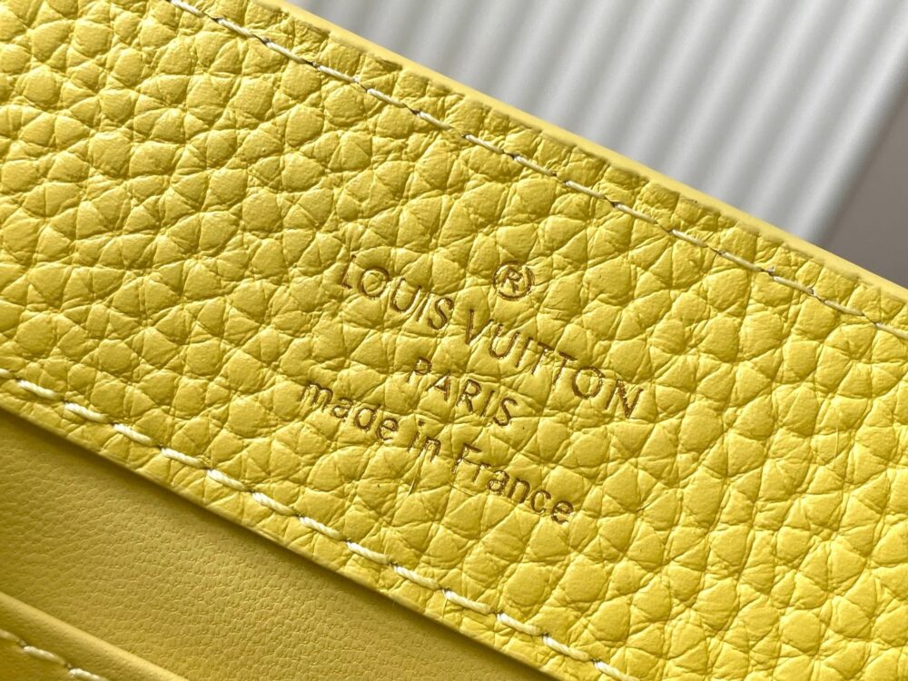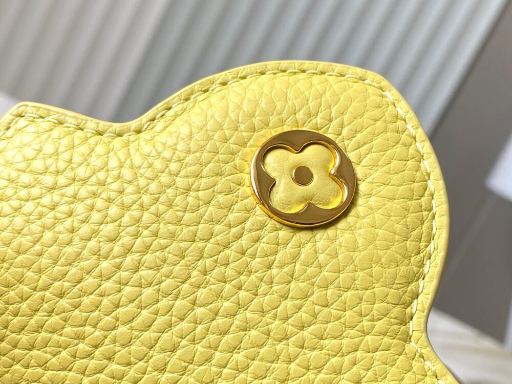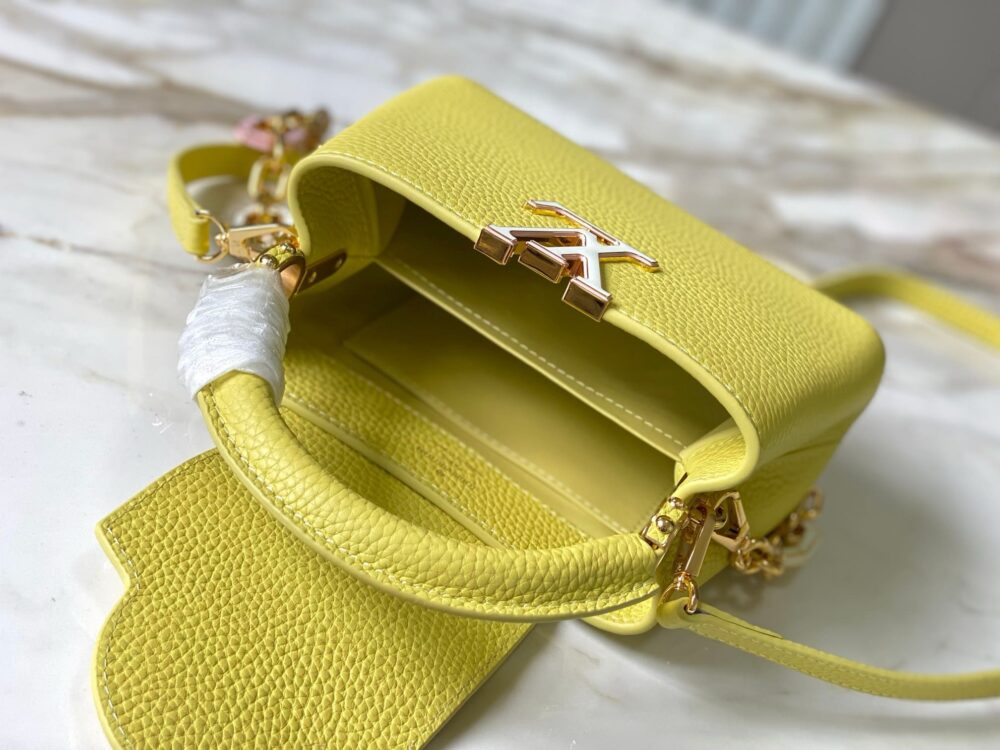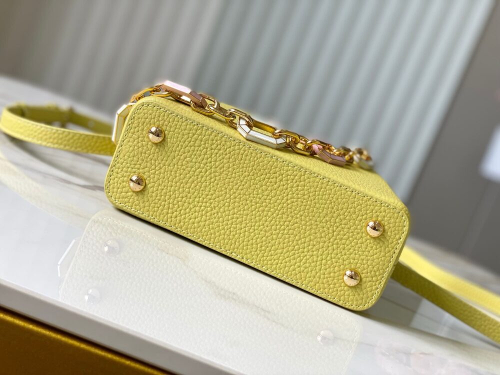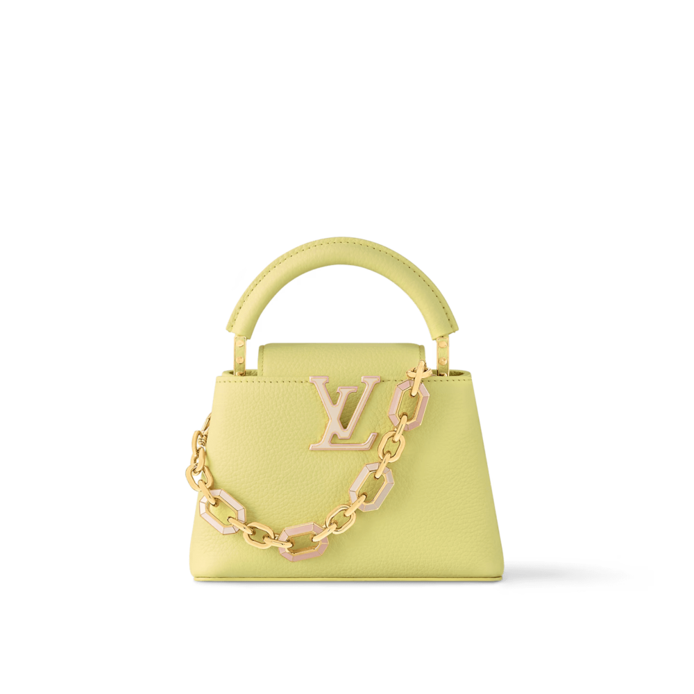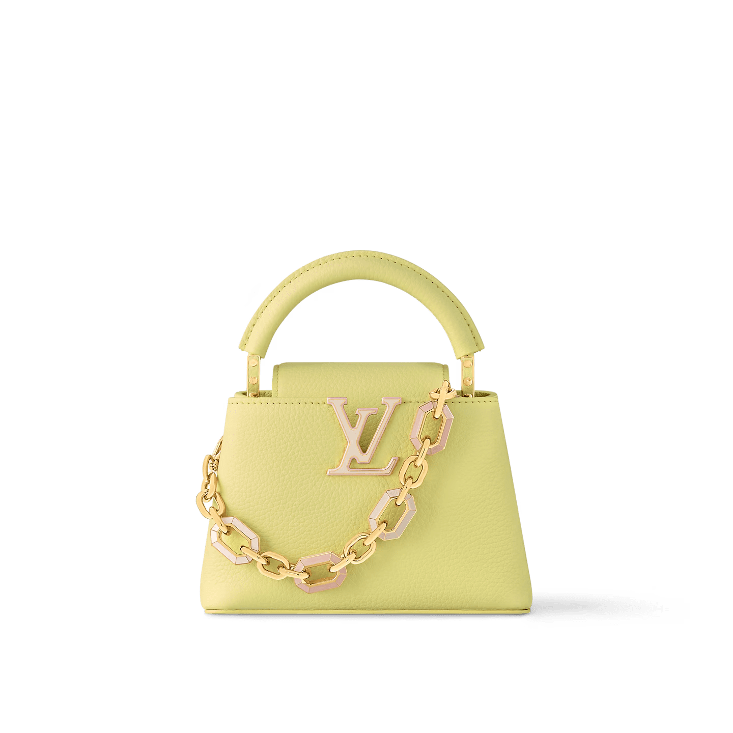 This Capucines Mini handbag in a tangy-colored Taurillon leather features a joyfully arty enameled chain. The luminous chain is made of octagonal links, evocative of Art Deco design, and adorned with colored enamel, carefully inlaid by hand. The bag’s signature LV Initials are rendered in 3D.