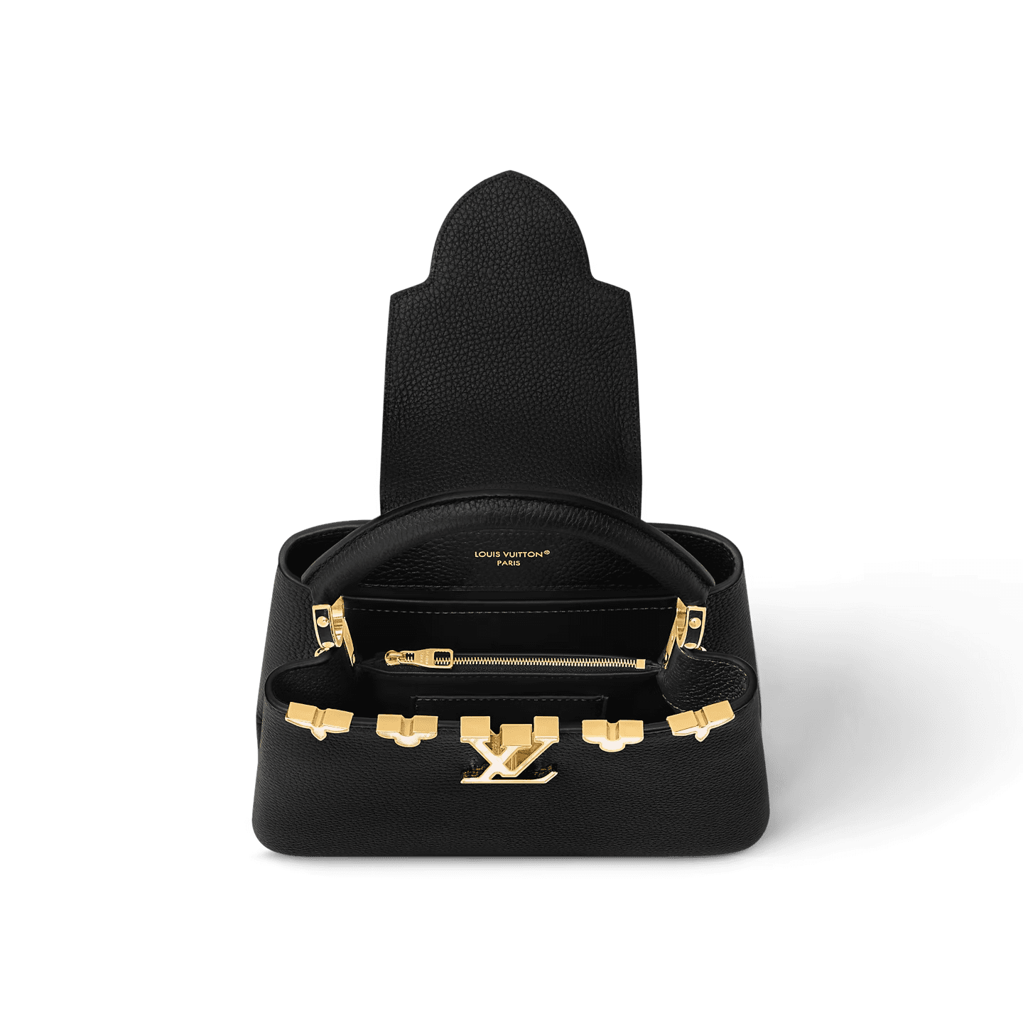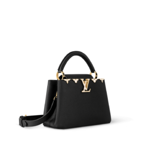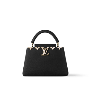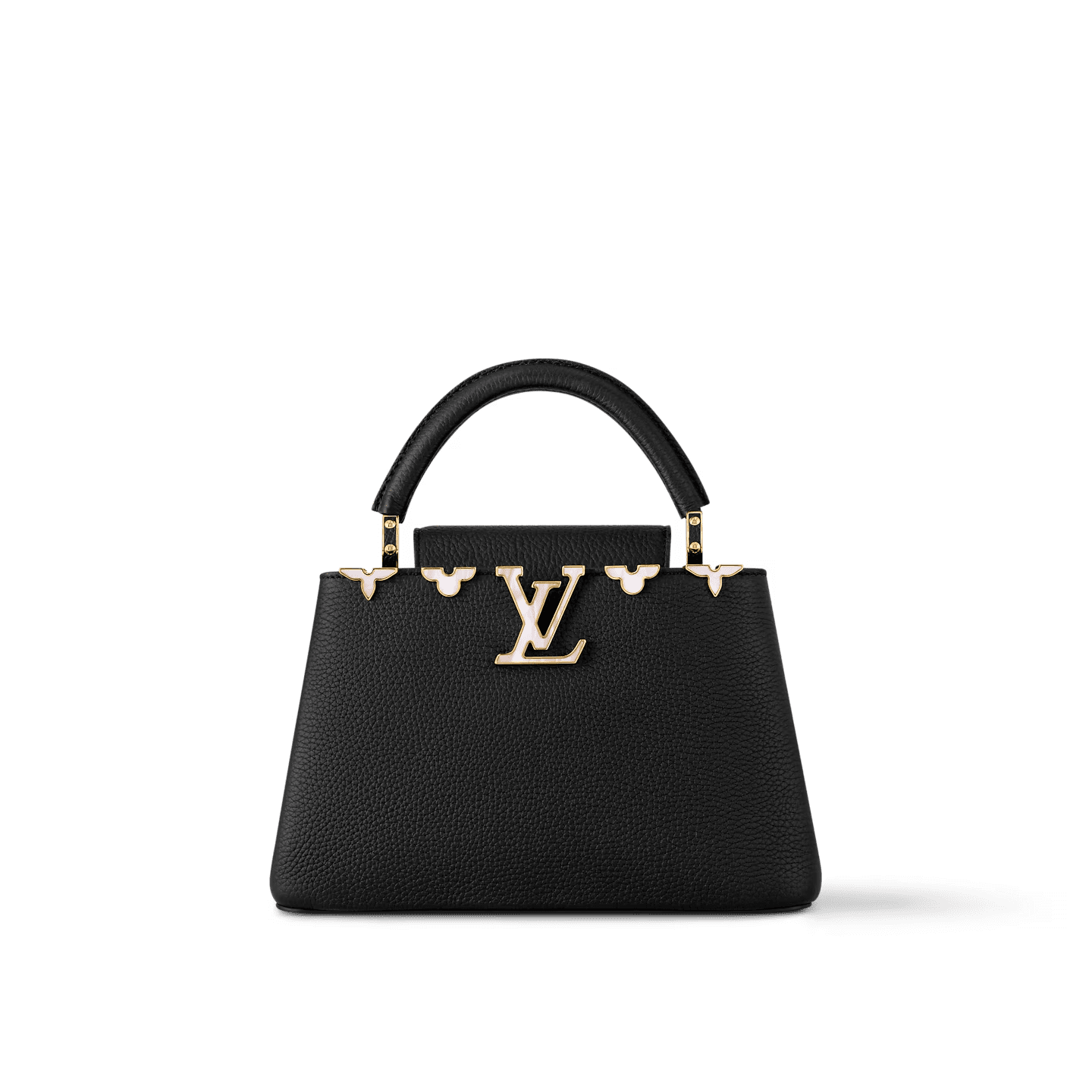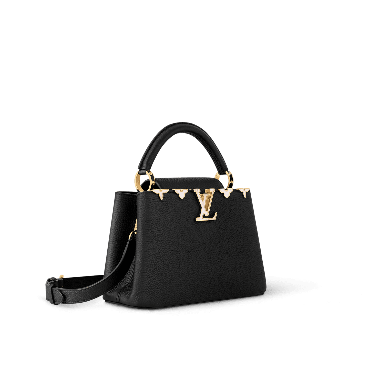 Crafted from timeless Taurillon leather, the Capucines BB is perfectly sized for both day and night. This edition is elevated with a crown of mother-of-pearl effect Monogram flowers, finished with elegant gold-toned hardware. The refined design opens to reveal a compartmented interior fitted with multiple pockets, and features a removable strap, offering numerous carry options.