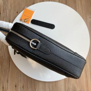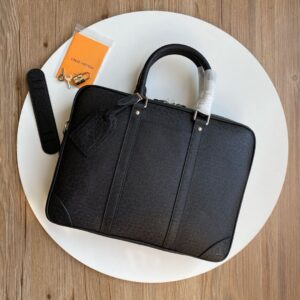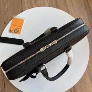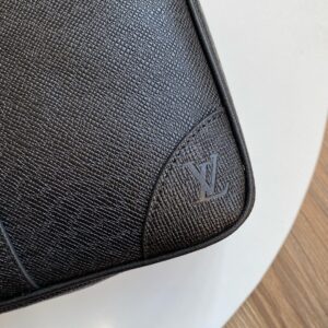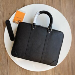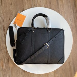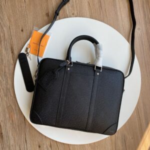 This Porte-Documents Voyage PM attaché case is made from Taiga Noir, a cowhide leather that is first smoothed and polished then embossed with fine grain detailing. The padded interior, roomy enough for a 13-inch laptop, has a double flat pocket on the back. There’s a detachable and adjustable shoulder strap in addition to the top handles.
