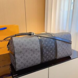 The Keepall Bandoulière 50 alternates blocks of dark Monogram Eclipse canvas with lighter Monogram Eclipse Reverse to create a bold masculine feel. This classic soft travel bag boasts leather top handles and two leather bands along the side, all in black, making it instantly recognizable. Cabin-friendly, it has an unexpectedly spacious interior.