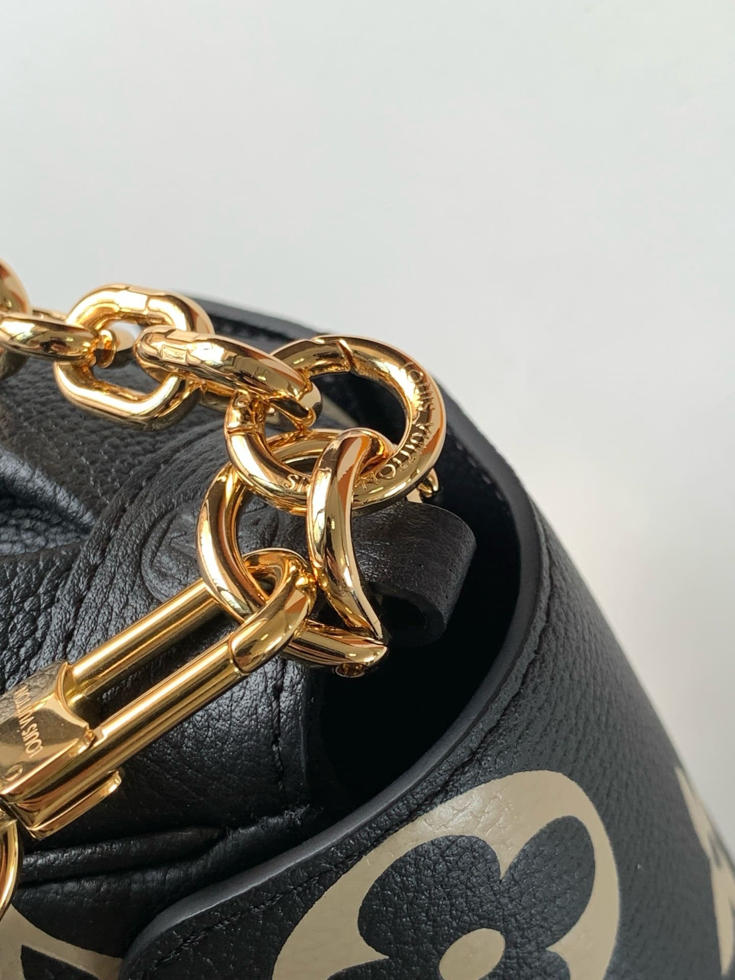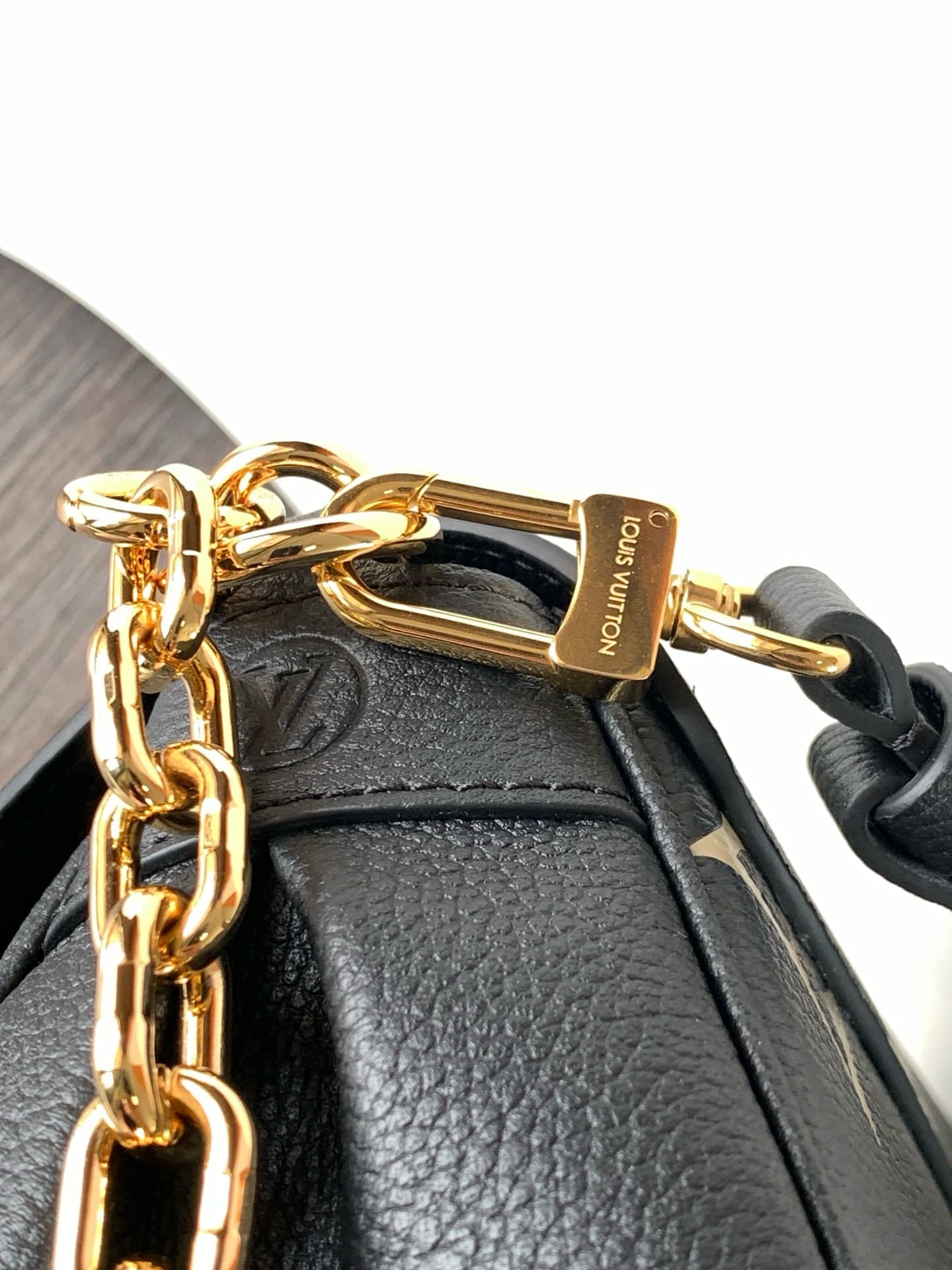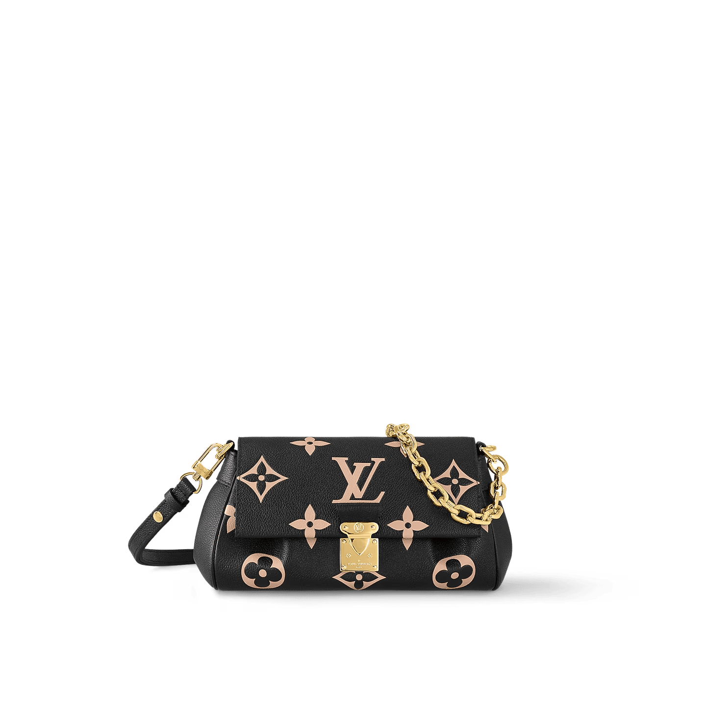The Favorite is a fashionable bag made from supple grained leather with an oversized embossed Monogram pattern. Feminine pleats bring a couture touch while the gold-color magnetic lock evokes Louis Vuitton’s heritage. A removable and adjustable strap invites short-shoulder carry or cross-body wear, while a bold detachable gold-color chain is ideal for glamorous evenings.