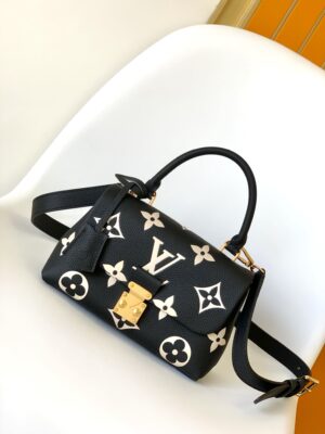 This Madeleine BB handbag is made from Monogram Empreinte leather with an over-sized Monogram pattern embossed and printed on the leather. This adorably compact bag has a red lining and closes with the same S-lock found on the Pochette Metis. The single, articulated top handle brings a ladylike feel while the removable strap provides additional carry options.