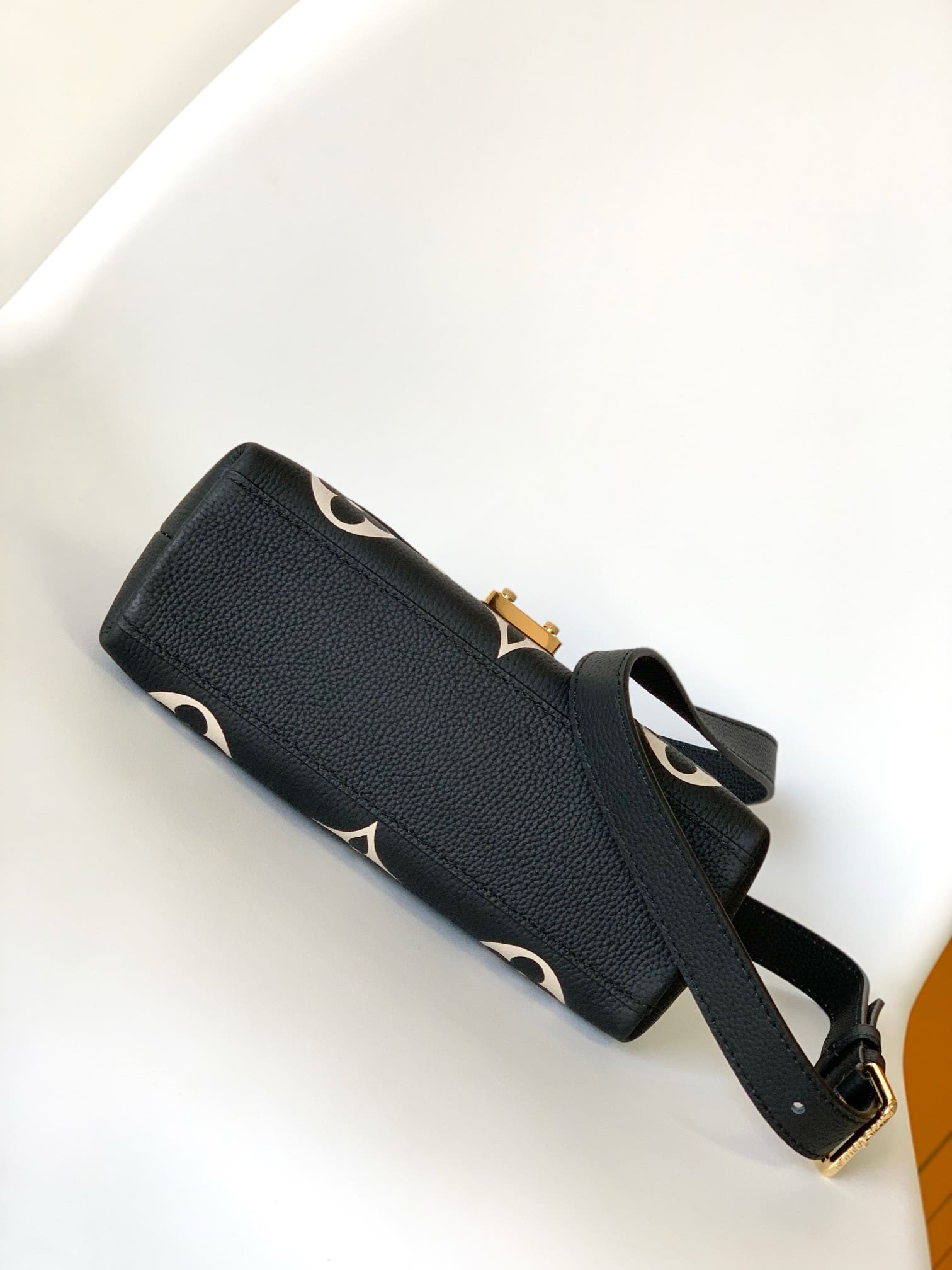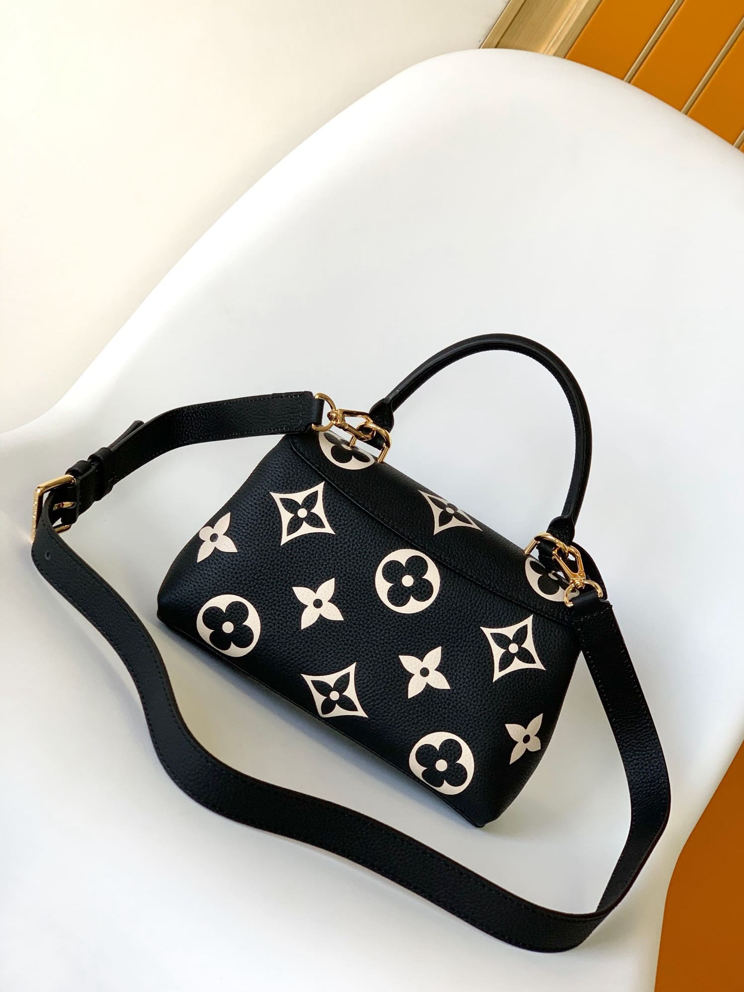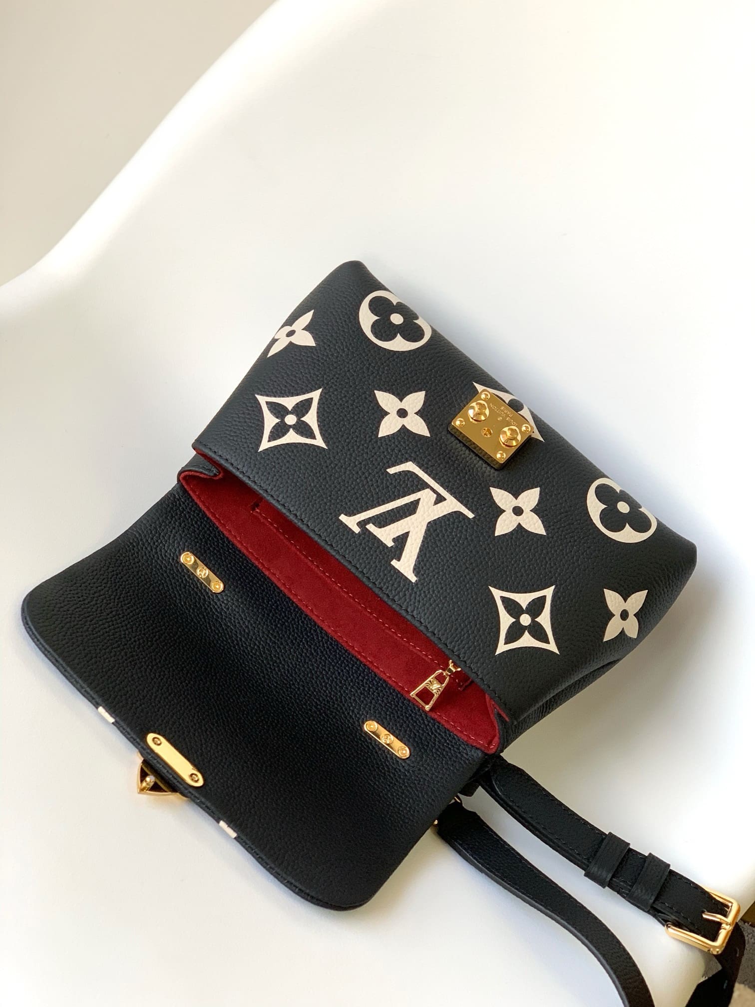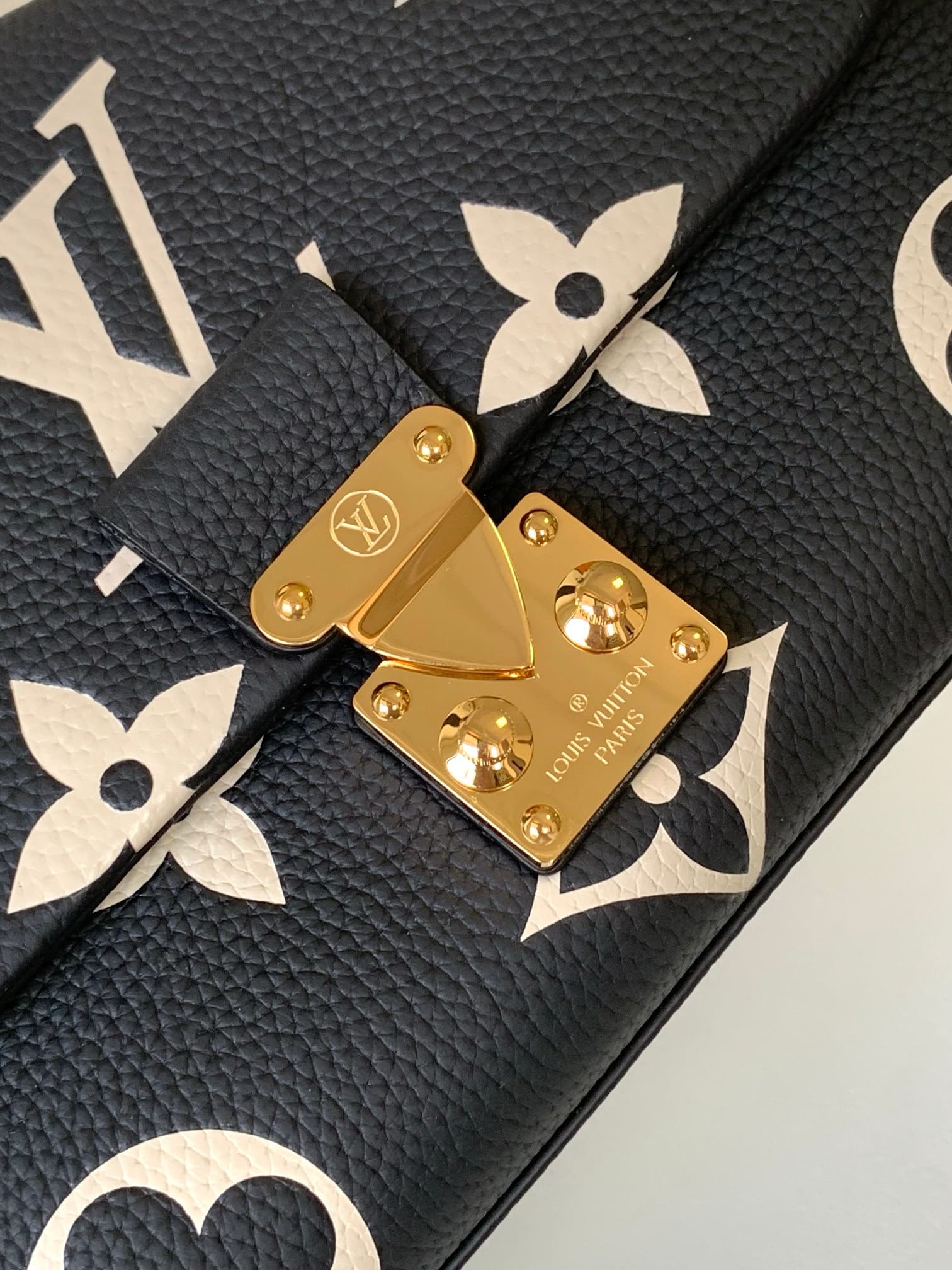 This Madeleine BB handbag is made from Monogram Empreinte leather with an over-sized Monogram pattern embossed and printed on the leather. This adorably compact bag has a red lining and closes with the same S-lock found on the Pochette Metis. The single, articulated top handle brings a ladylike feel while the removable strap provides additional carry options.