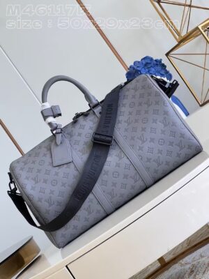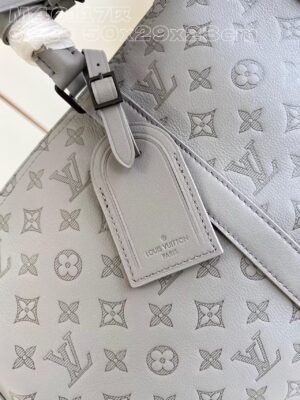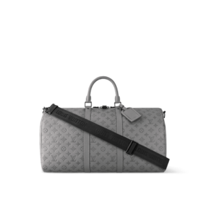 Louis Vuitton’s classic Keepall gets a contemporary new look with Monogram Shadow leather in a sophisticated shade of gray. Soft, supple calf leather is embossed with the House’s historic Monogram pattern for a refined signature touch. A large-capacity bag, perfect for short trips or as a carry-on.