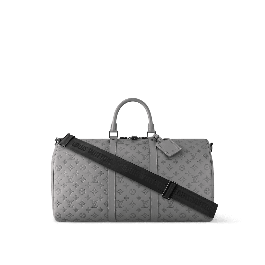Louis Vuitton’s classic Keepall gets a contemporary new look with Monogram Shadow leather in a sophisticated shade of gray. Soft, supple calf leather is embossed with the House’s historic Monogram pattern for a refined signature touch. A large-capacity bag, perfect for short trips or as a carry-on.