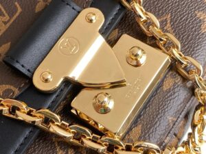 For Spring 2022, Louis Vuitton launches the feminine Marceau chain handbag. Inspired by the design of the Pochette Metis, it’s a compact bag with plenty of storage, that closes with a S-lock, reminiscent of those on the House’s heritage trunks. The gold-color sliding chain has a leather shoulder pad for more comfort.
