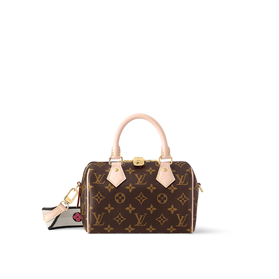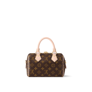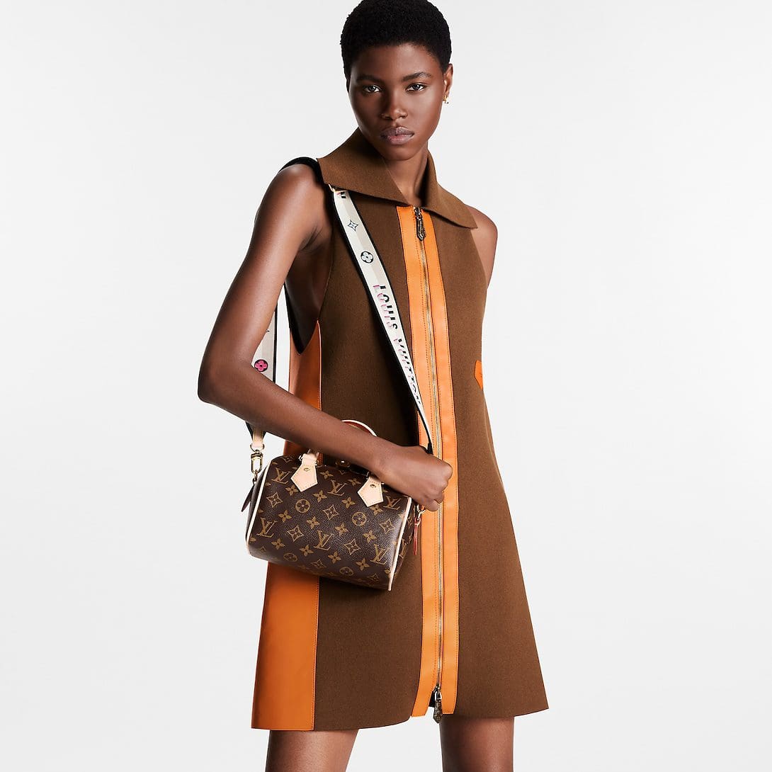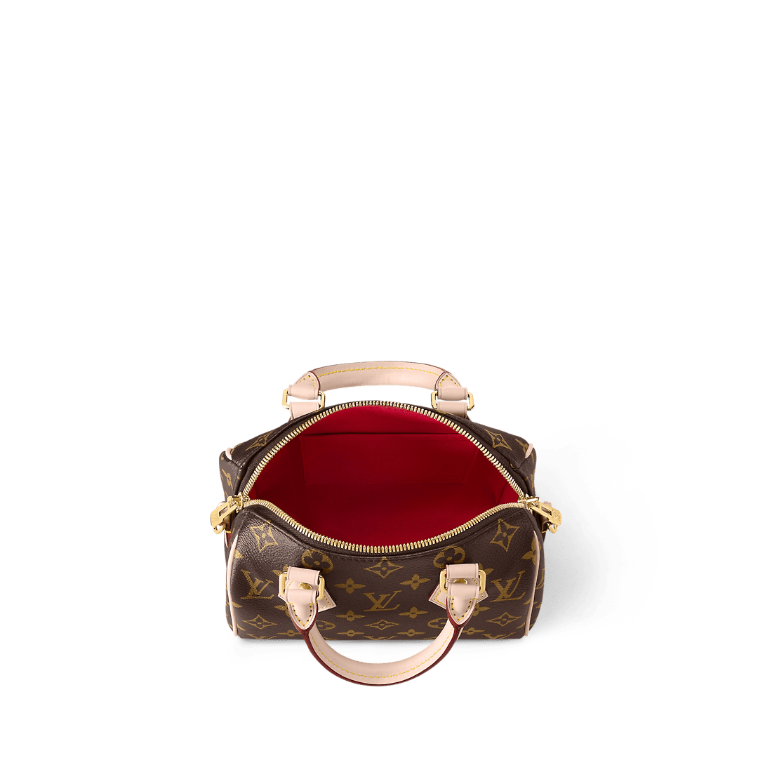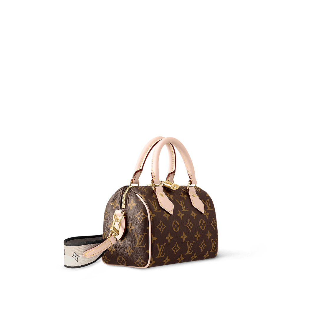 Like a diminutive version of the House’s historic Speedy travel bag, the Speedy Bandoulière 20 bag is crafted from Monogram canvas with natural cowhide trims. In addition to the rolled leather top handles, there is a wide detachable and adjustable textile strap with a woven Louis Vuitton signature. This bag’s classic design is completed with a red textile lining.