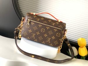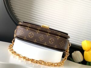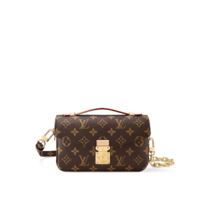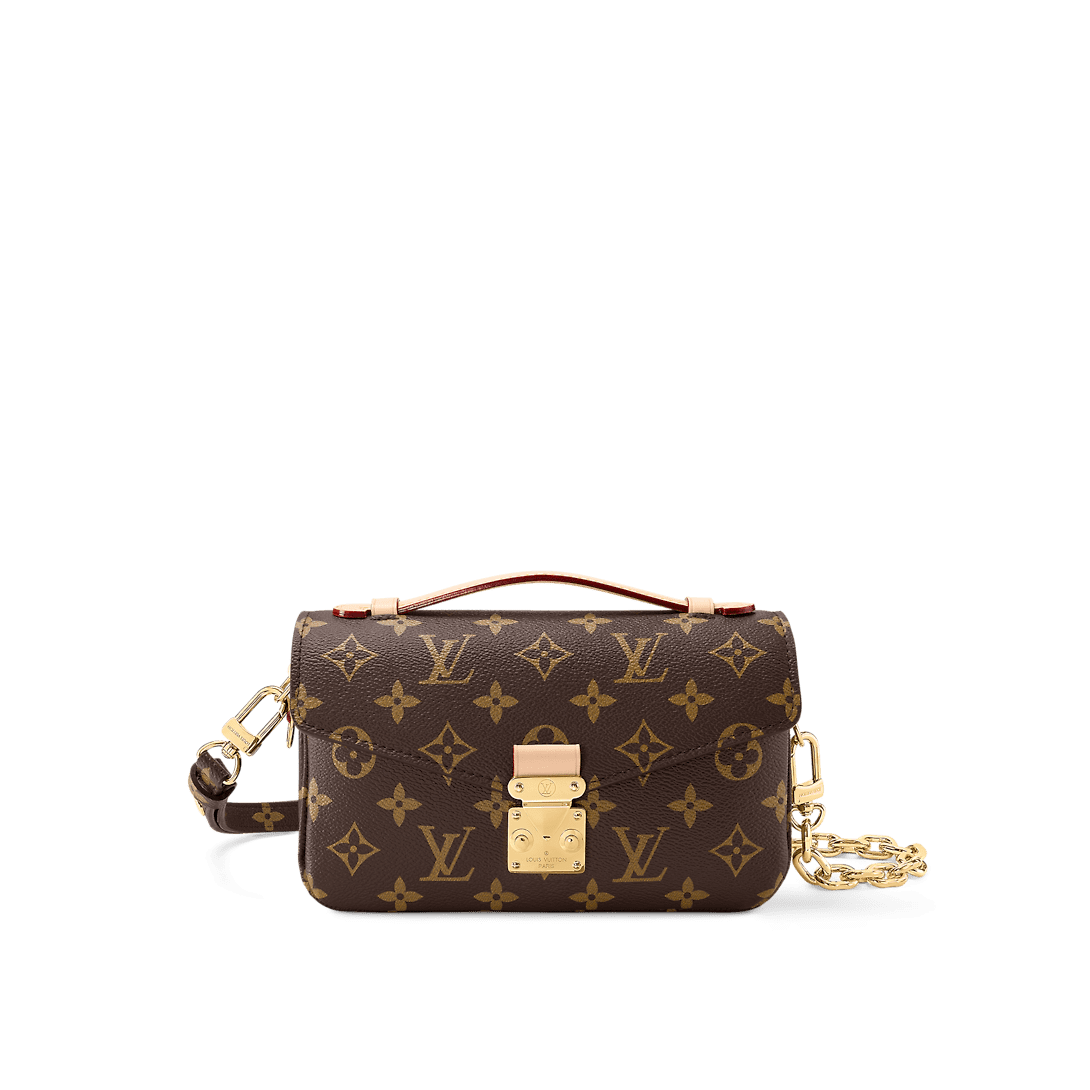 Made from Monogram canvas with natural cowhide-leather trim and the S-lock signature, the Pochette Métis East West bag combines emblematic House cues with new contemporary details like a gold-color chain for fashionable short-shoulder carry. Roomy enough to store a smartphone, it has three inside compartments, a zipped pocket inside, and another outside.