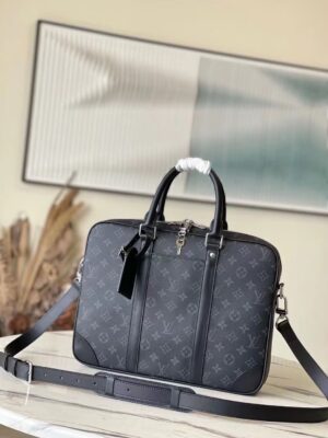 The Voyage Small Briefcase is crafted in Monogram Eclipse canvas with a clean silhouette, leather top handles, side straps and reinforced corners. The removable and adjustable shoulder strap allows for a variety of carrying options.