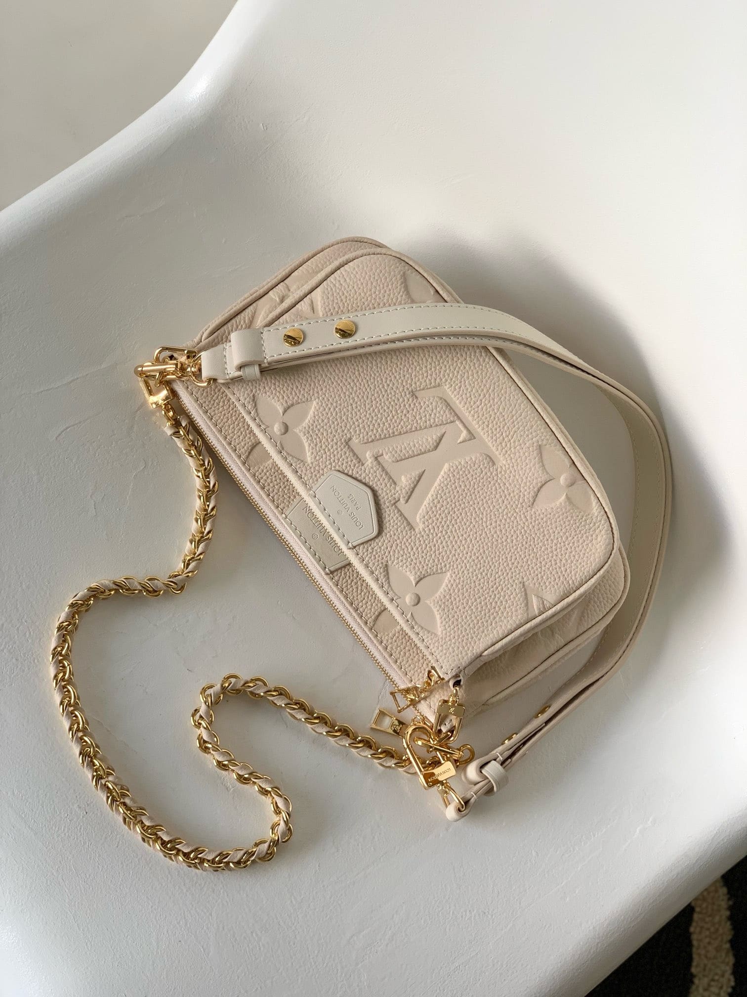 Made from cream-colored Monogram Empreinte leather, the Multi Pochette Accessoires handbag is composed of two pouches attached together. Both pouches are lined with matching cream-color microfiber, with the larger pouch also including an inside pocket. Thanks to a chain and a strap, both removable, this bag becomes very verstaile.