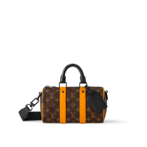 The compact Keepall Bandoulière 25 is fashioned from Monogram Macassar coated canvas with leather side bands in a lively saffron. The hardware, including the rivets just below the handle mounts, is a matte black. A wide textile strap, with a woven tone-on-tone “Louis Vuitton” pattern, enables shoulder and cross-body carry.