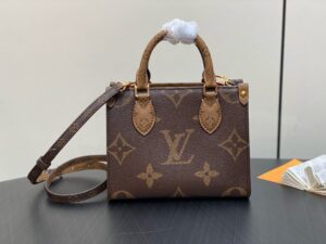 This charmingly petite version of the OnTheGo tote is made from Monogram canvas with Monogram Reverse on the leather handles and handle mounts. This micro-bag includes all the classic details of the full-size model and is large enough to fit a phone. In addition to the two top handles, there’s a removable and adjustable strap.