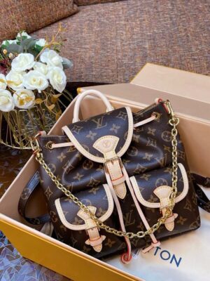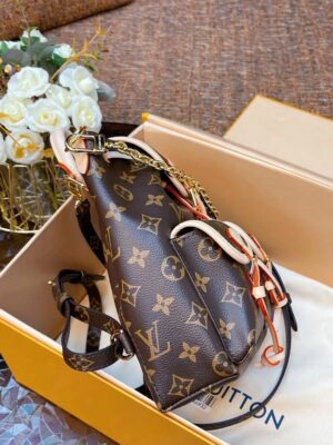 Made from Monogram canvas with leather trim, the super-cute, super-functional Excursion PM backpack has a design clearly influenced by the world of hiking. The main compartment closes with an adjustable sliding buckle and there are two pockets with buckles on the front. A gold-color chain, in addition to the top handle, enable different carries.