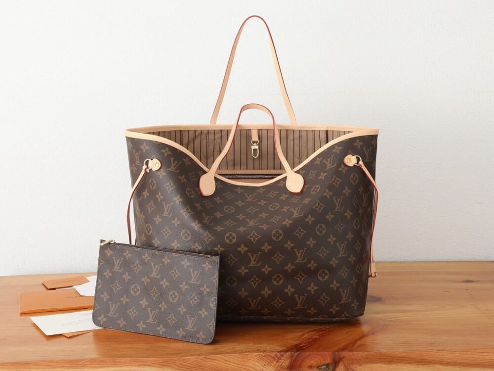 The Neverfull GM tote unites timeless design with heritage details. Made from supple Monogram canvas with natural cowhide trim, it is ultra-roomy but never bulky, with side laces that cinch for a sleek allure or loosen for a more casual look. Slim, comfortable handles slip easily over the shoulder or arm. Lined in colorful textile, it features a removable pouch which can serve as a clutch or an extra pocket.