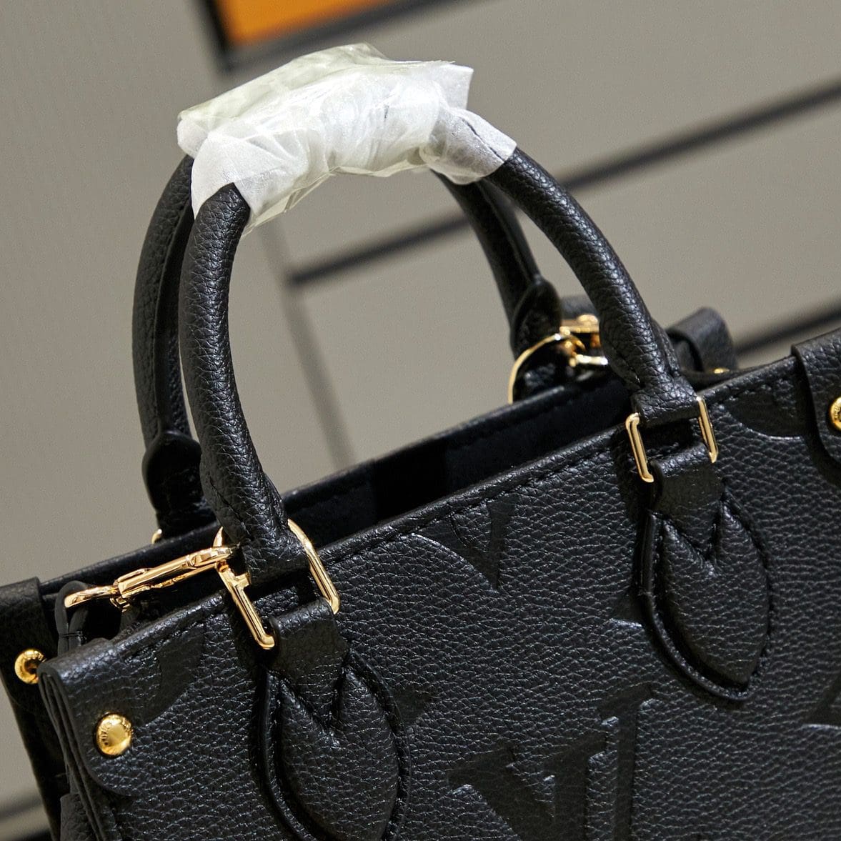 The OnTheGo BB is an on-trend micro-bag fashioned from Monogram Empreinte leather, with Monogram embossing. This tiny tote boasts all details of the full-size model – including the distinctive handle mounts and riveted leather tabs on the corners – and can fit a smartphone and compact wallet. A removable and adjustable strap enables shoulder carry.