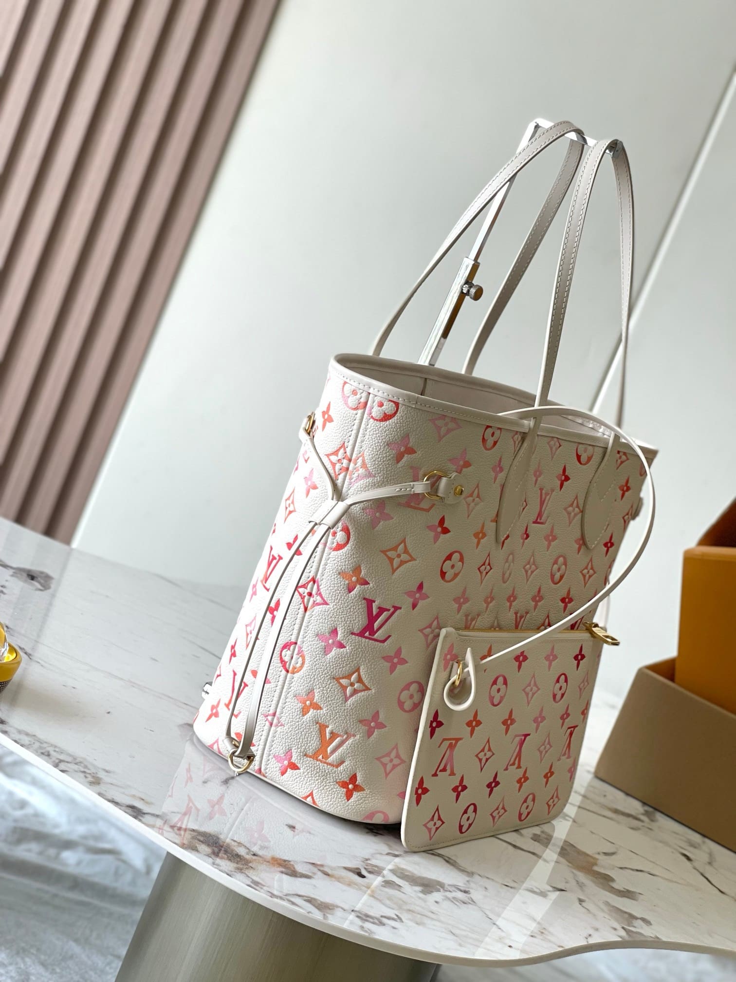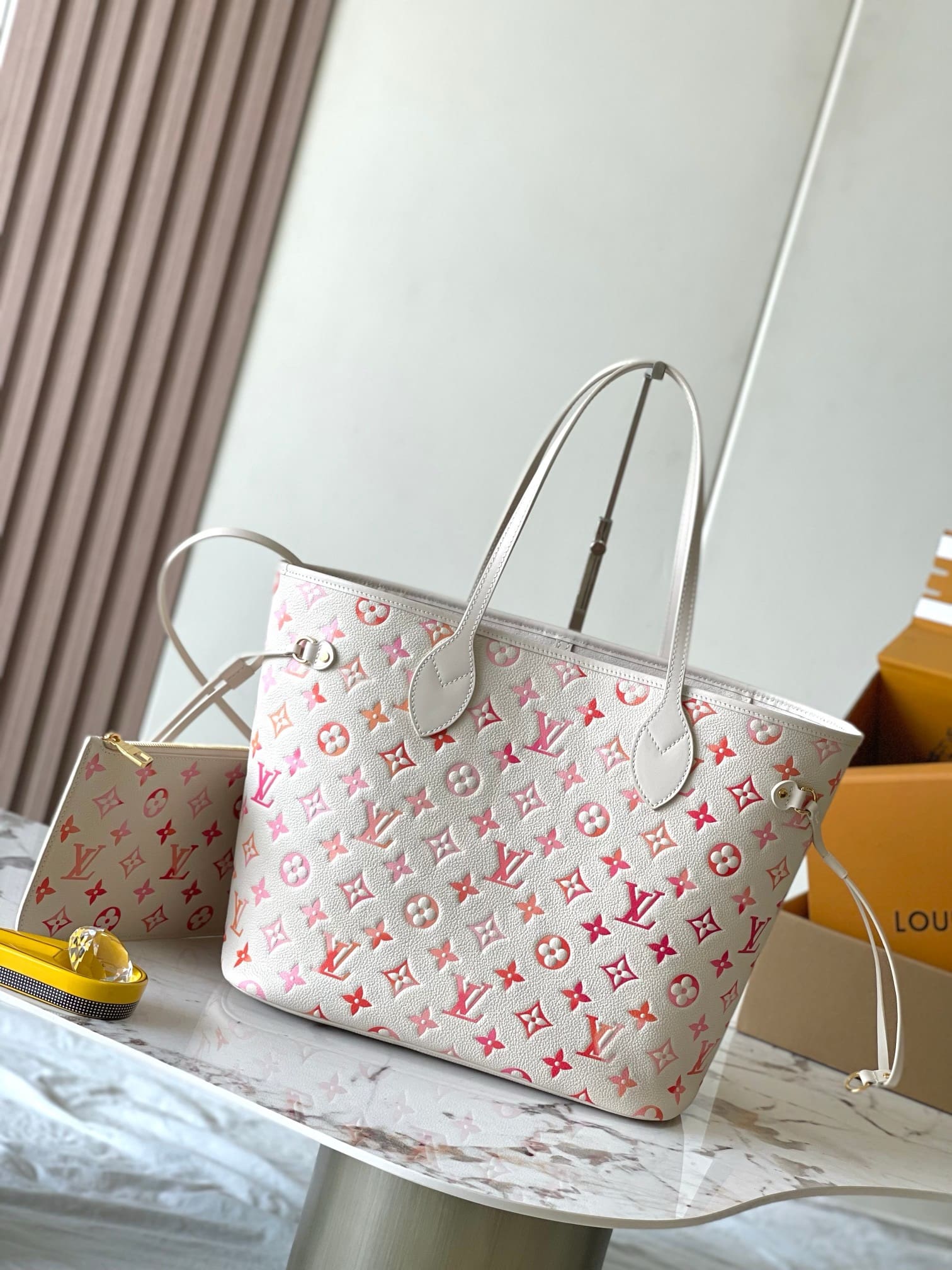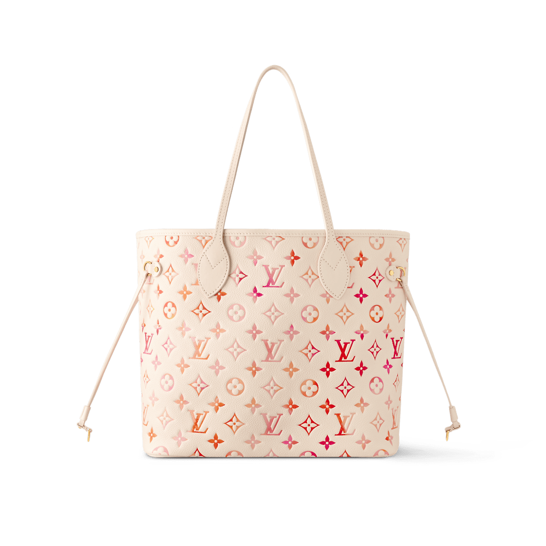 This Neverfull MM tote bag is made from Monogram Empreinte Sunrise Aquarelle leather. This distinctive gradient treatment of the orange, pink and fuchsia printed on top of the Monogram embossing brings a joyful feel. To enhance the texture, a hint of glossiness is screen-printed onto the surface, making it glisten like morning dew.