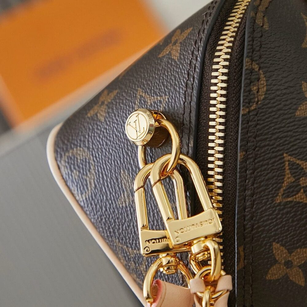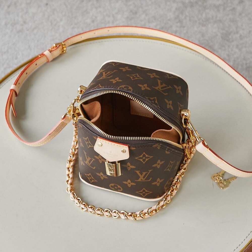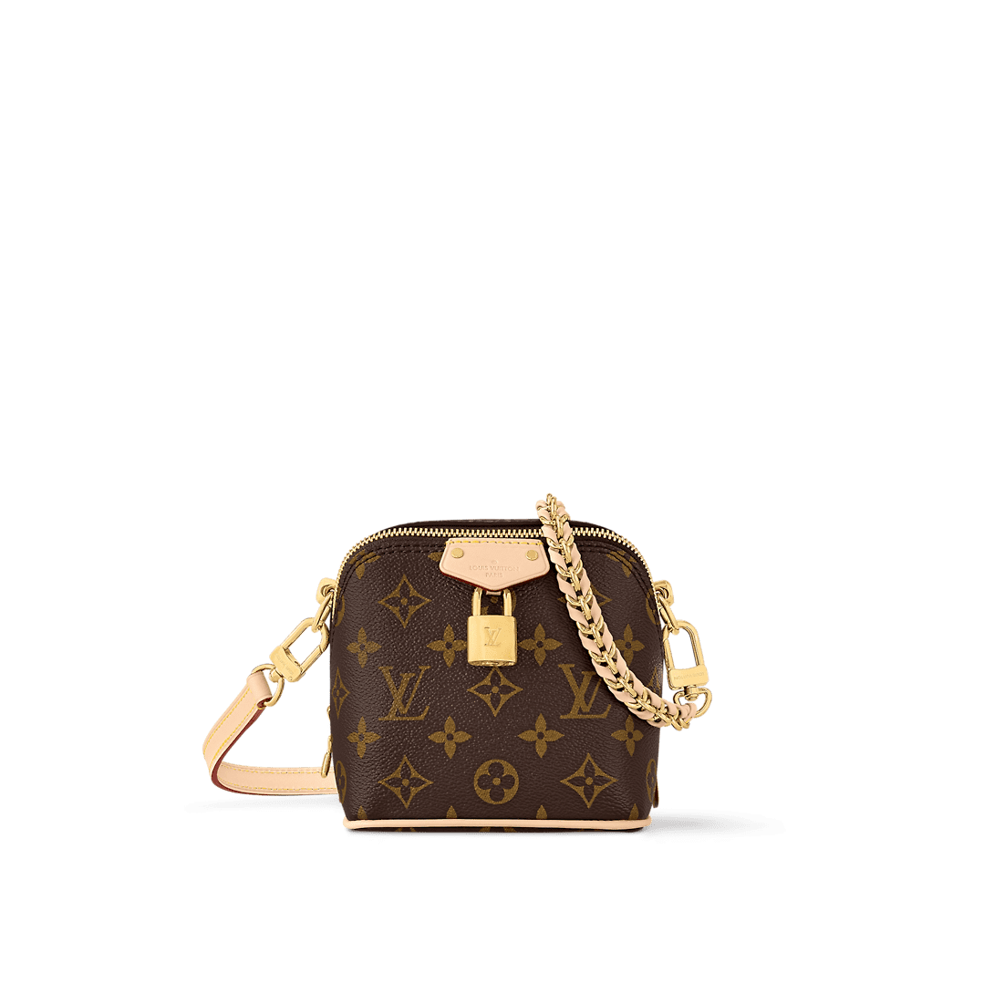 The Maison salutes its travel heritage with the Just In Case handbag. Made from Monogram canvas with natural cowhide-leather trim, this compact model keeps essentials – smartphone, keys, makeup – always close at hand. Detailed with a signature padlock and key bell, the bag is fitted with a leather-braided chain and a leather strap, both removable, for a variety of modern carry options.