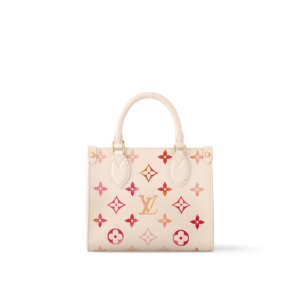 Part of the Sunrise Aquarelle collection, this OnTheGo BB handbag is fashioned from Monogram Empreinte leather in a colorway of orange, pink and fuchsia, inspired by sunrise. The LVs and Monogram Blossoms printed on the leather have a watercolor aspect. A hint of glossiness is screen-printed onto the surface, like glistening drops of morning dew. Two rolled-leather top handles and a removable and adjustable strap enable various carry options.