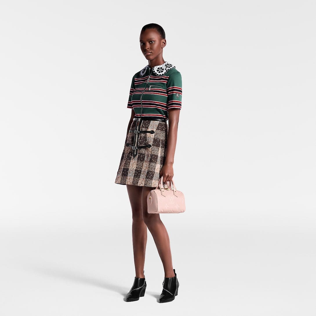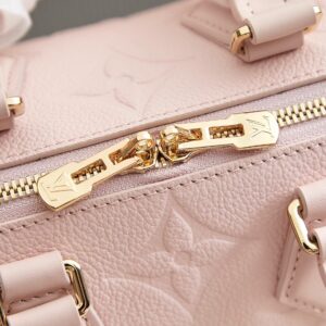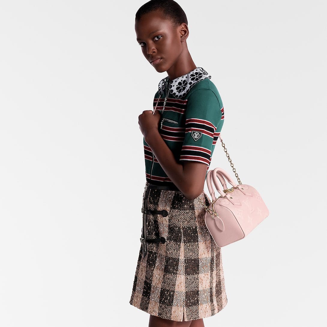 The Speedy 20 Bandoulière handbag is made from Monogram Empreinte leather in a soft pastel colorway. The bag’s unique shape is inspired by the House’s Speedy travel bag from the 1930s. A removable and adjustable chain-strap enables shoulder wear while the two top handles allow hand carry.