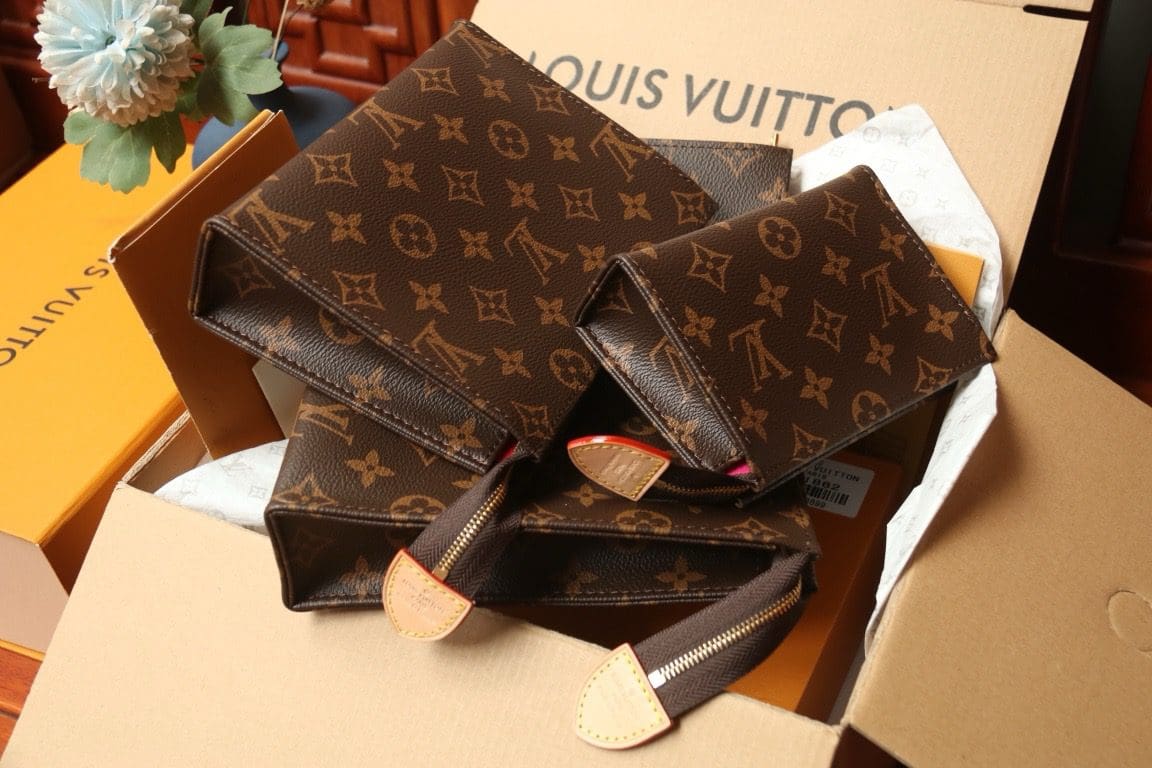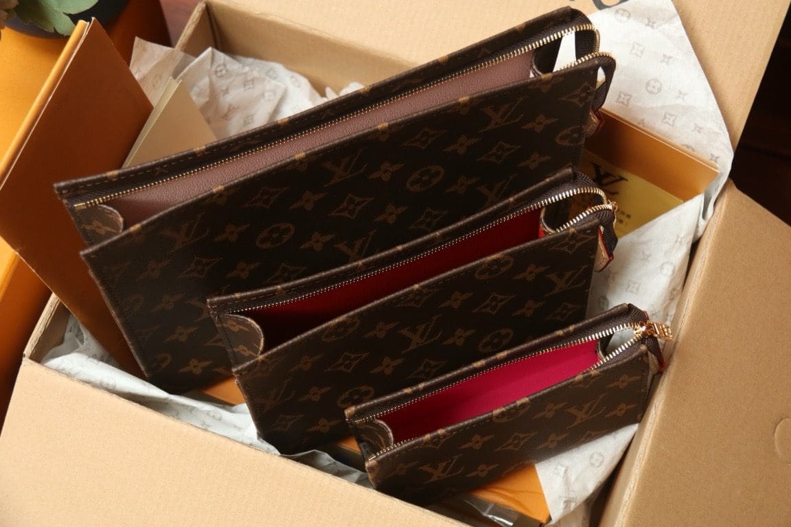 The Trio Toilet Pouch is a set of three, different-sized, classic Louis Vuitton pouches. All made from Monogram canvas, each pouches have a different vibrant-colored lining – all of them washable – making them as elegant as they are practical. These finely crafted pieces are finished with ruthenium-color hardware.