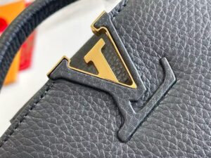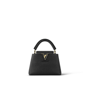 The refined Capucines Mini handbag looks stunningly chic in rich black Taurillon leather finished with golden handle rings and the emblematic LV Initials. This smaller version of the classic Capucines is a pleasure to carry over the shoulder or cross-body thanks to its wide removable strap.