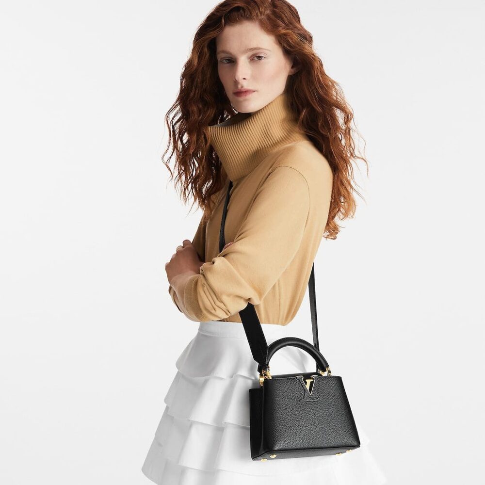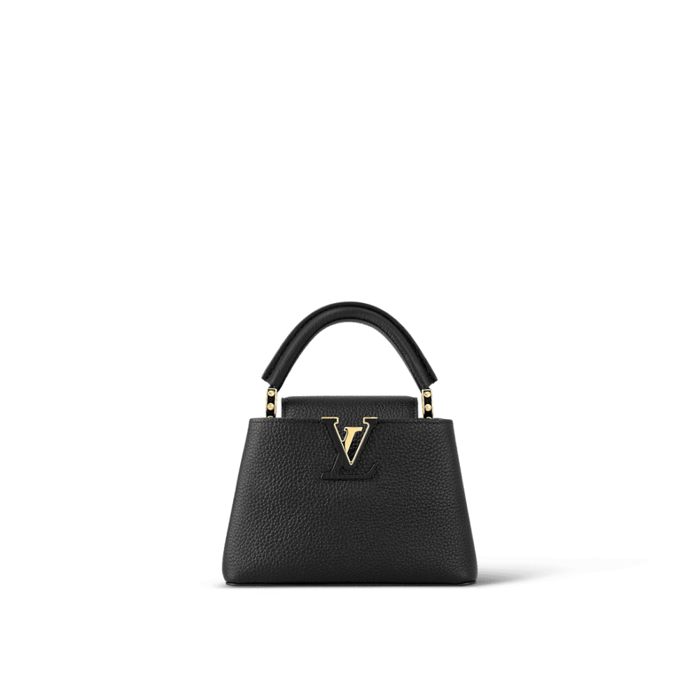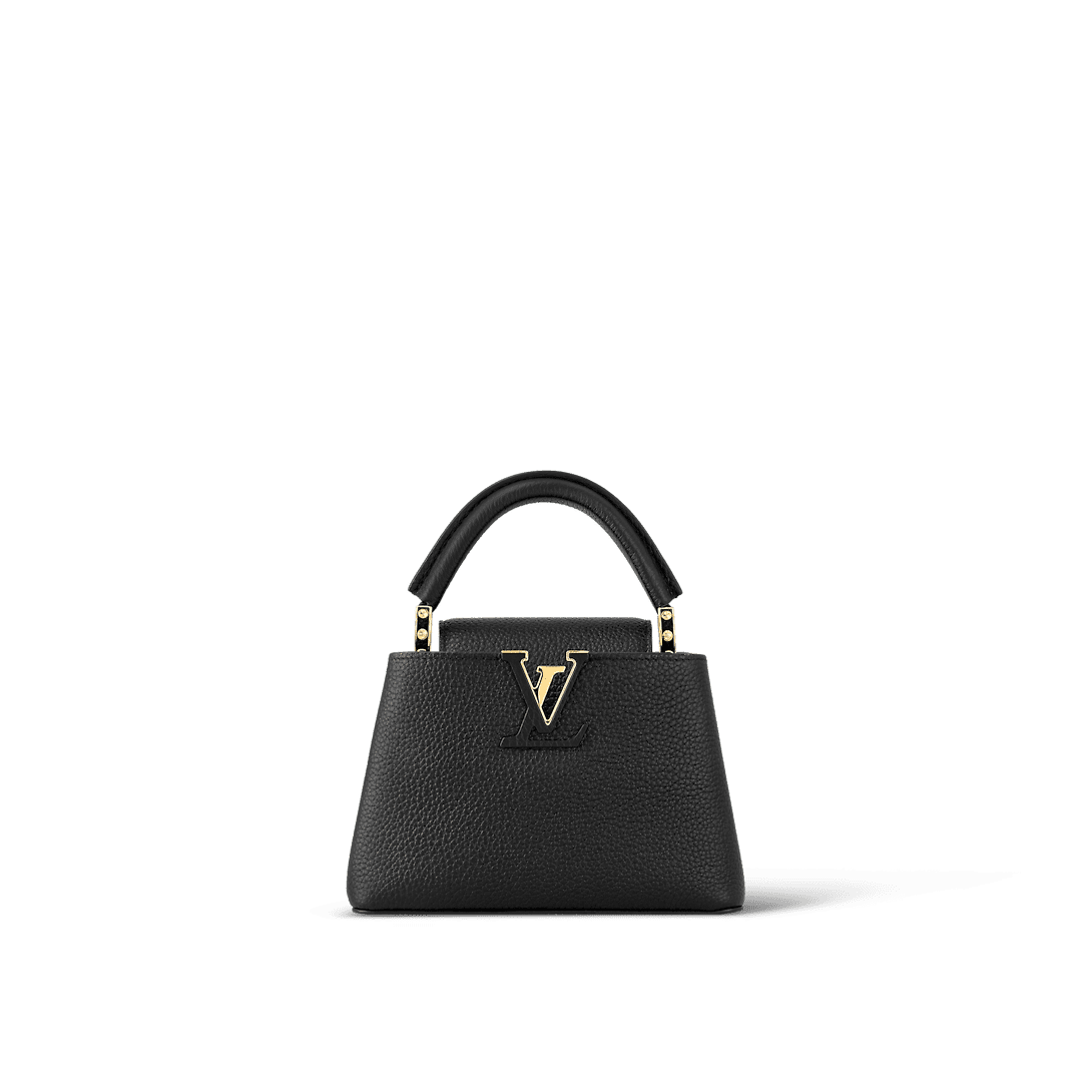 The refined Capucines Mini handbag looks stunningly chic in rich black Taurillon leather finished with golden handle rings and the emblematic LV Initials. This smaller version of the classic Capucines is a pleasure to carry over the shoulder or cross-body thanks to its wide removable strap.