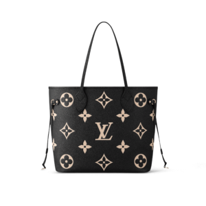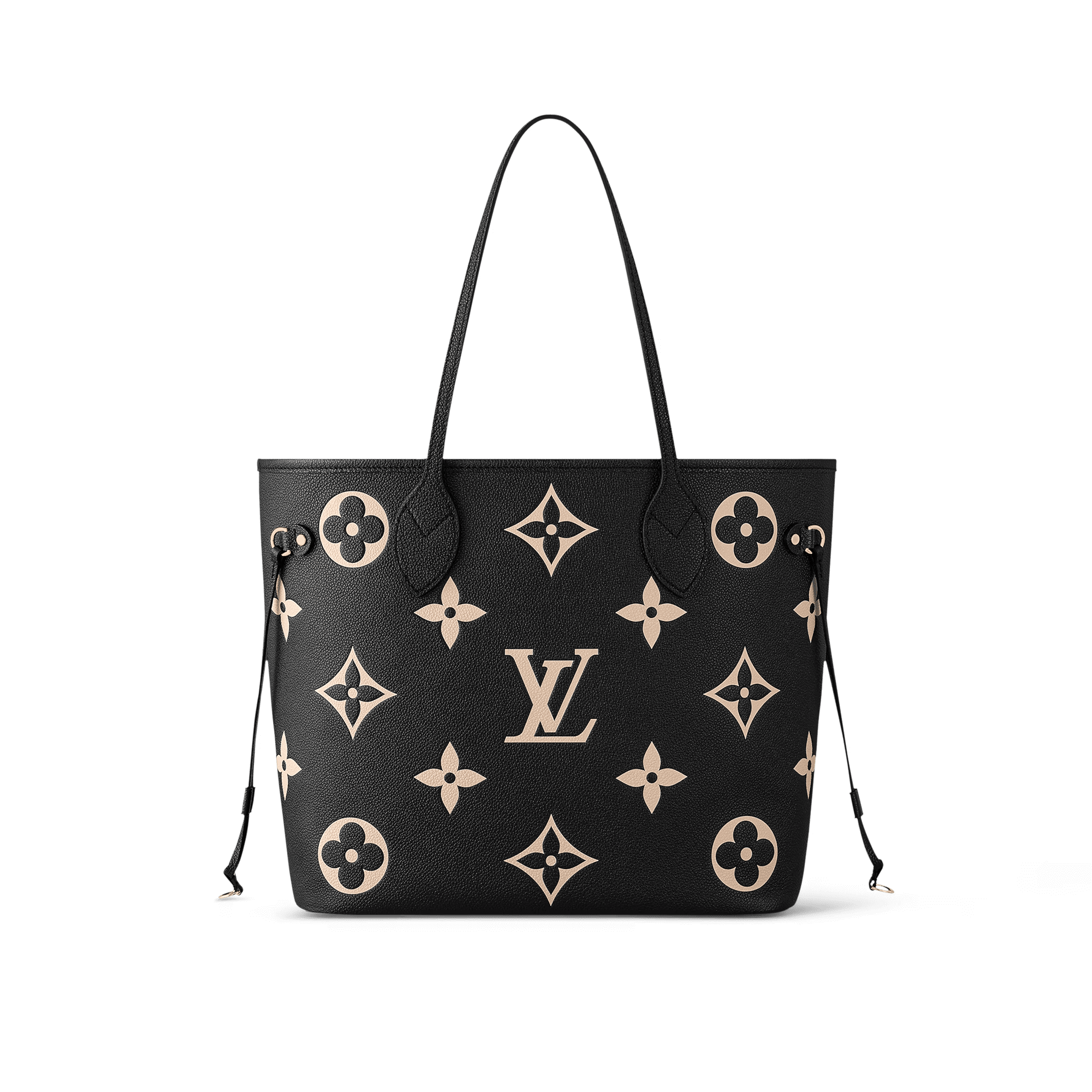 Ideal for everyday use, the roomy Neverfull MM tote bag is made from black cowhide leather with the Monogram pattern embossed then printed in beige on the leather. Cinch the side laces and this tote transforms into an elegant city bag. It can be carried on the shoulder or the elbow, thanks to the long shoulder handles.