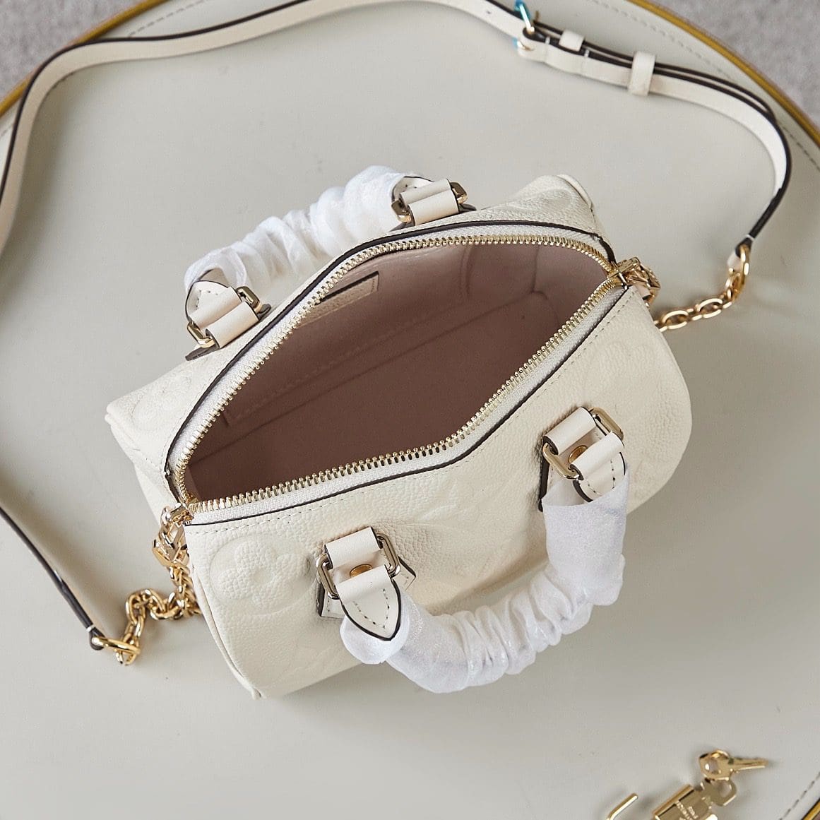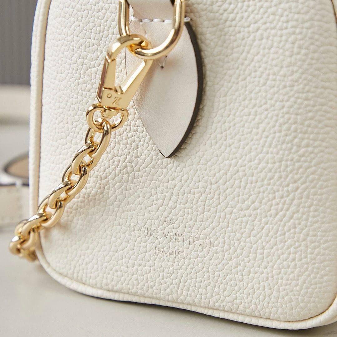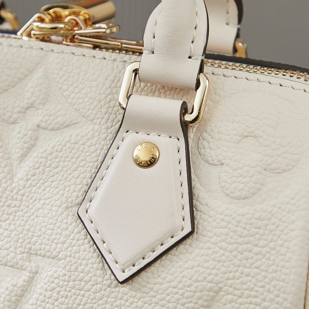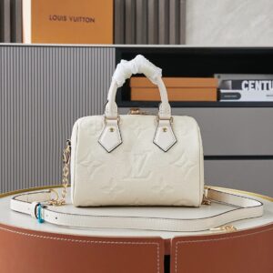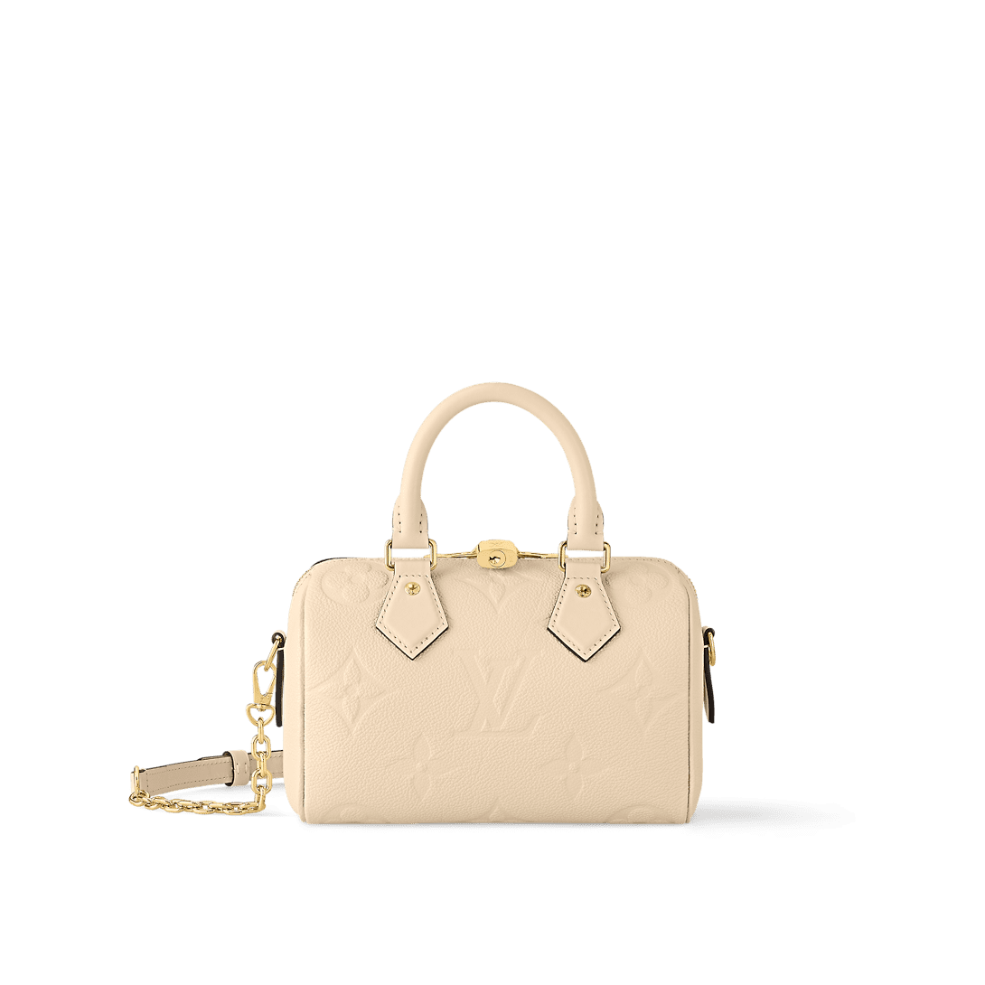 One of the House’s classic silhouettes, the Speedy Bandoulière 20 handbag takes on a timeless elegance in cream-color Monogram Empreinte leather with matching microfiber lining. The bag’s unique lines and two top handles evoke Louis Vuitton’s travel bags from the early 20th century. A removable chain-and-leather strap enables comfortable shoulder and cross-body carry.