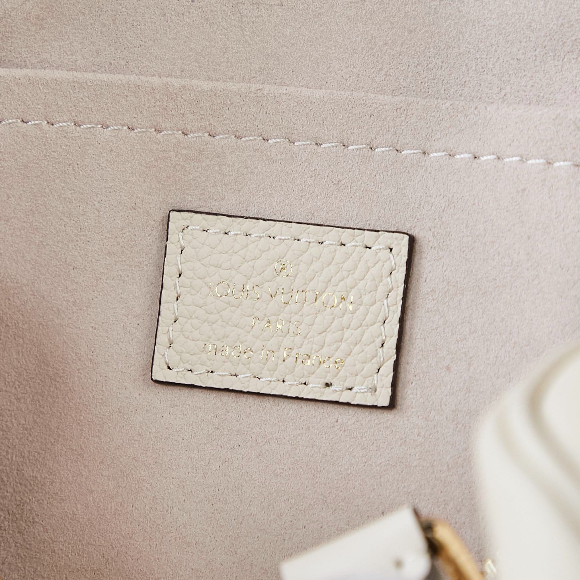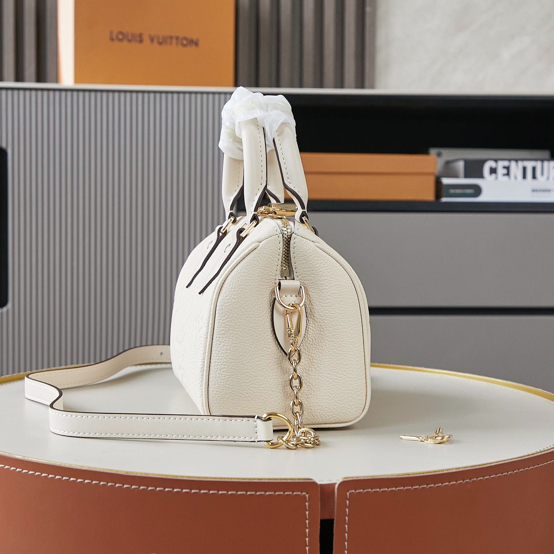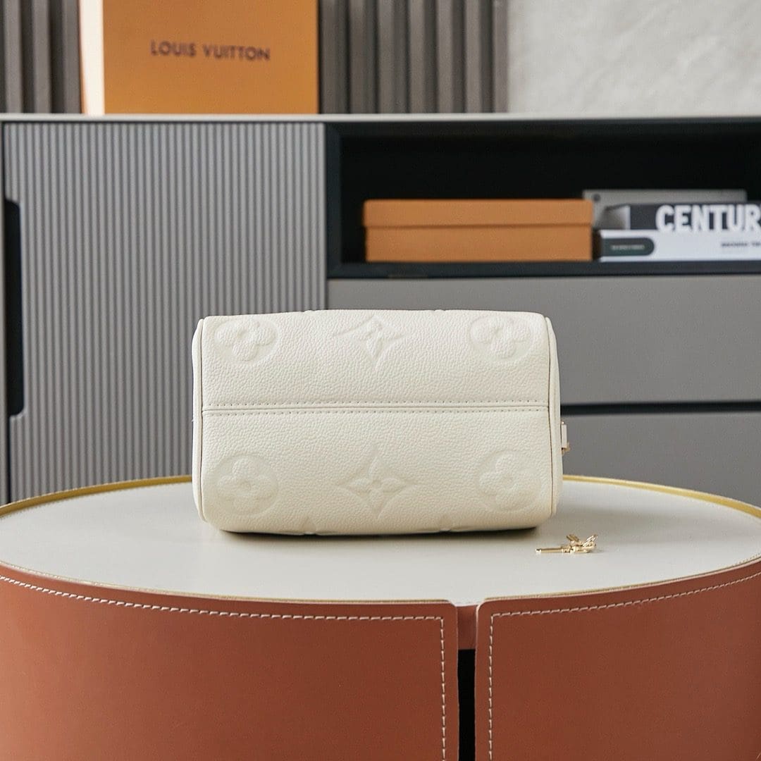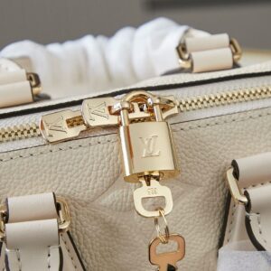 One of the House’s classic silhouettes, the Speedy Bandoulière 20 handbag takes on a timeless elegance in cream-color Monogram Empreinte leather with matching microfiber lining. The bag’s unique lines and two top handles evoke Louis Vuitton’s travel bags from the early 20th century. A removable chain-and-leather strap enables comfortable shoulder and cross-body carry.