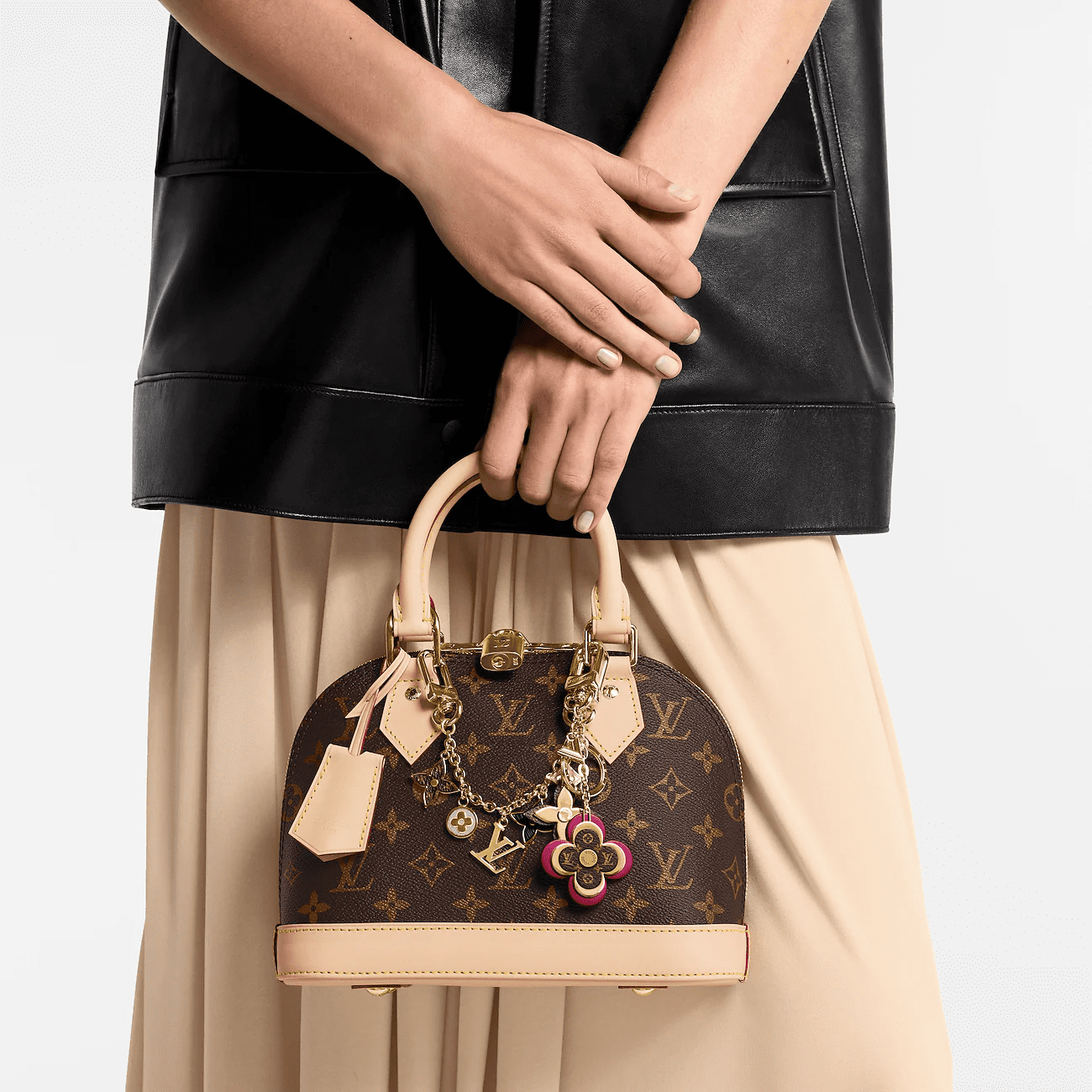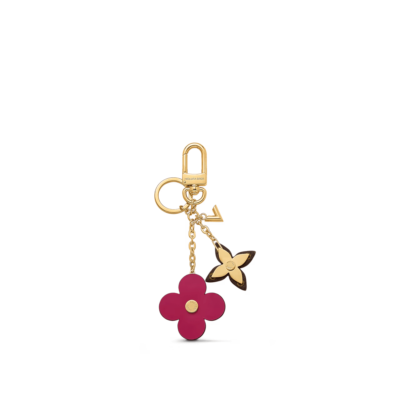 The Blooming Flowers bag charm and key holder is inspired by the classic Monogram Flowers print. Its complementary mix of materials is a nod to the expertise of Louis Vuitton’s trunk-making heritage. The three individual charms are crafted from Monogram coated canvas, Epi leather and metal. It can be secured to a bag or keys thanks to its dual-function clasp.