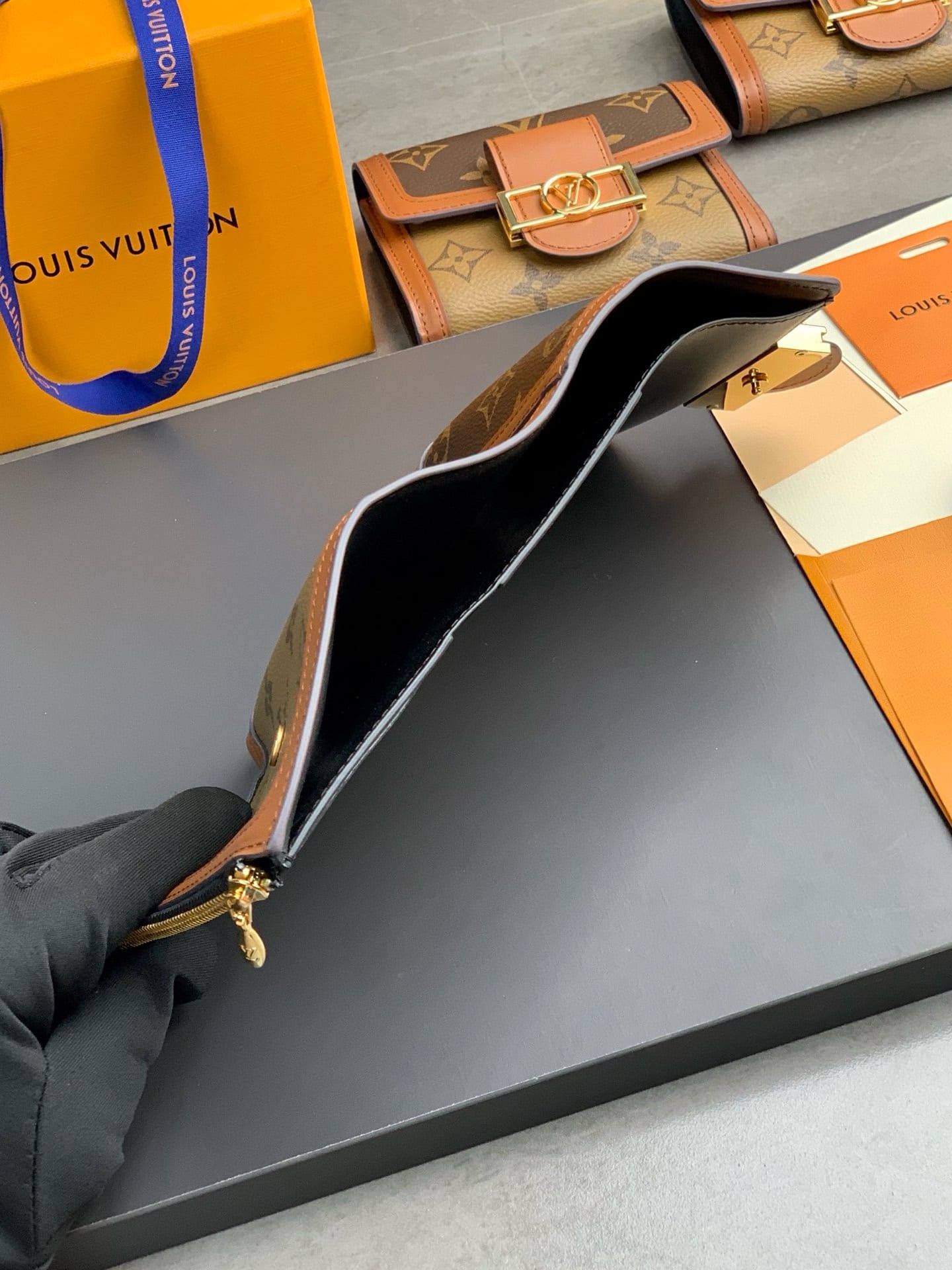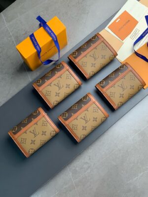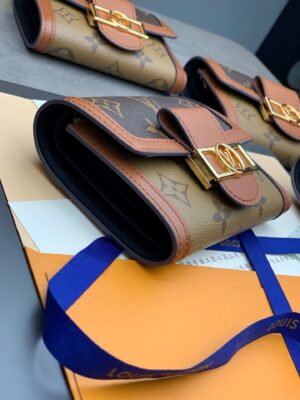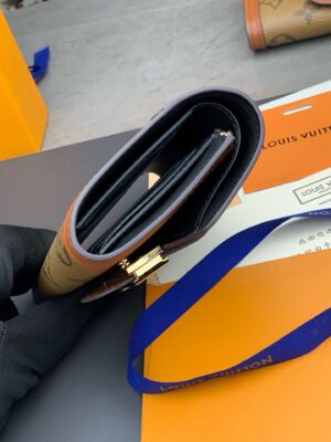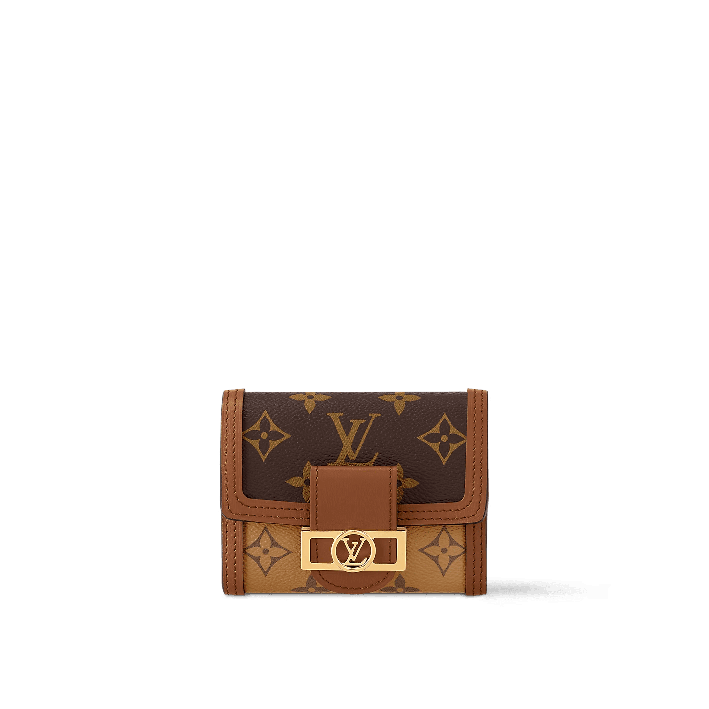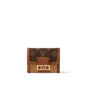 The Dauphine compact wallet takes its style cues from the emblematic Dauphine handbag. Its finely crafted design combines Monogram and Monogram Reverse canvas with calfskin trim, while it is secured by a magnetic Dauphine-signature clasp. This space-efficient wallet features a long pocket for bills and a zipped coin pocket on the side.