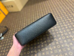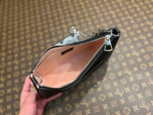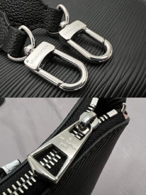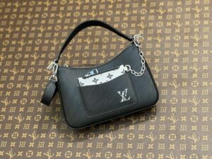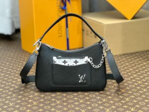The Marelle handbag is fashioned from grained Epi leather with a detachable canvas pouch that sits in an outside pocket and is attached to the bag with a chain. The Marelle can be carried by hand, elbow or shoulder with its detachable top handle, or worn as a cross-body thanks to its removable and adjustable leather strap.