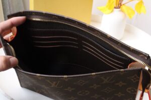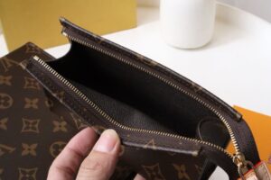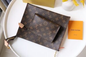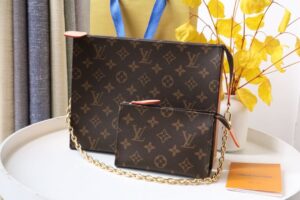 The Toiletry Pouch On Chain was inspired by the Monogram Toiletry Pouch cosmetic pouch, created in 1901, which Louis Vuitton clients also used as a clutch. This reworked design adds a removable chain and refined natural leather trim to create a fashionable bag, which can be carried in the hand or on the shoulder. Concealed inside is a smaller version of the pouch, which can also be used separately.