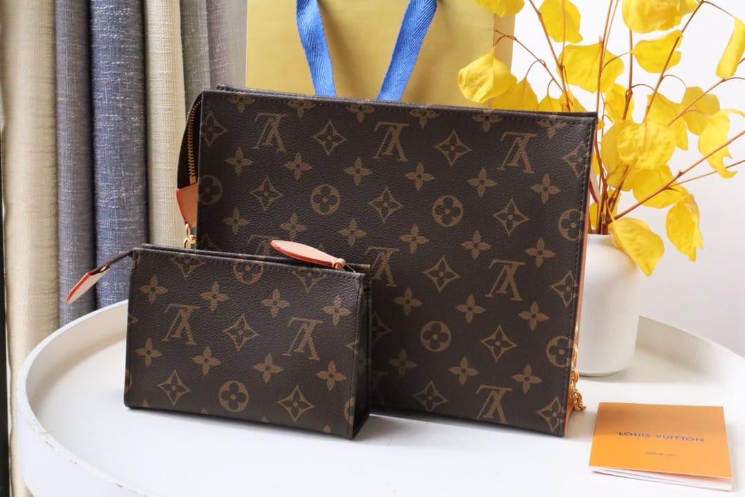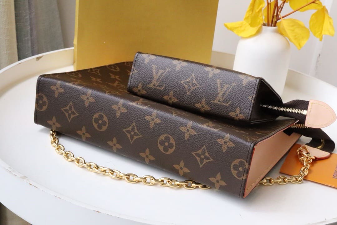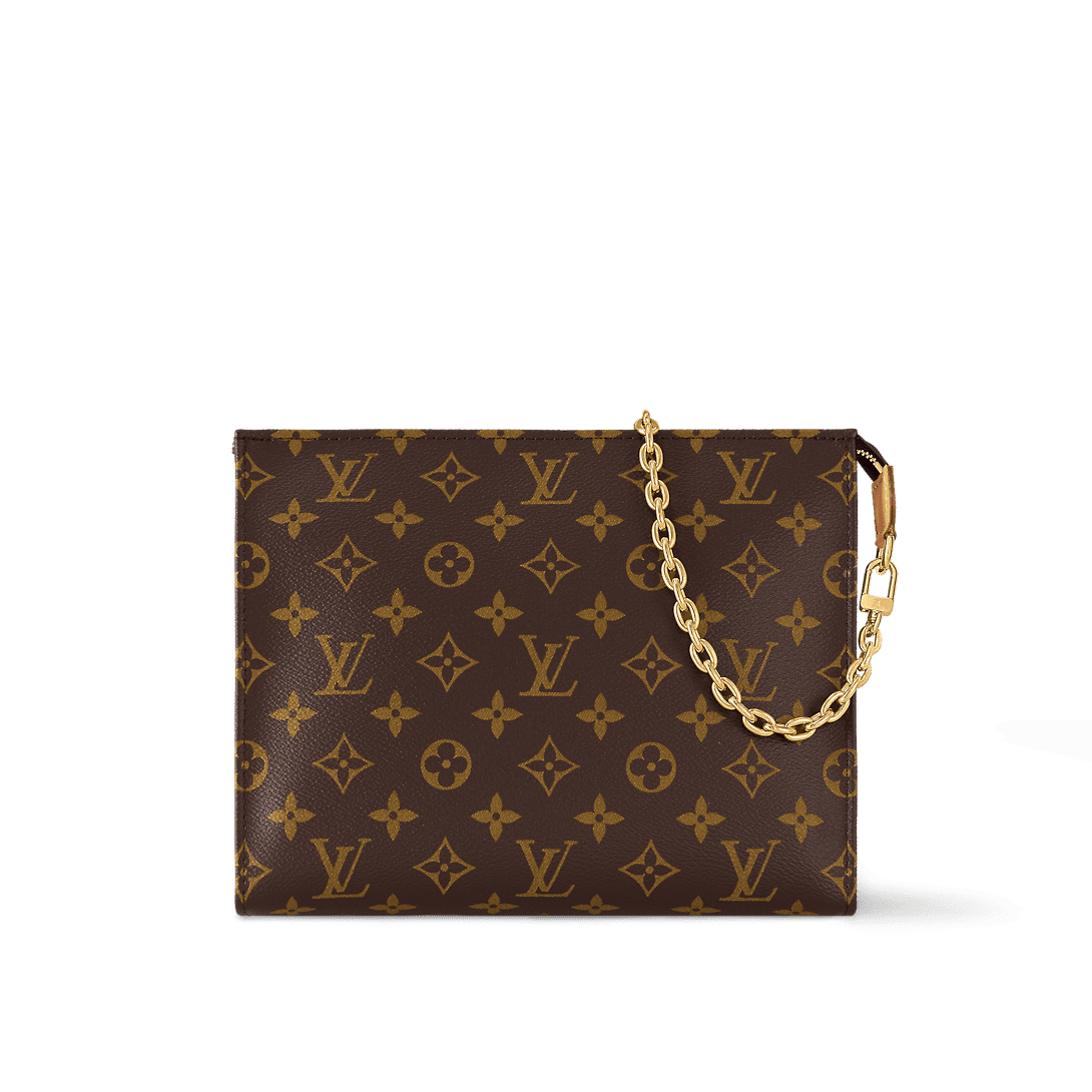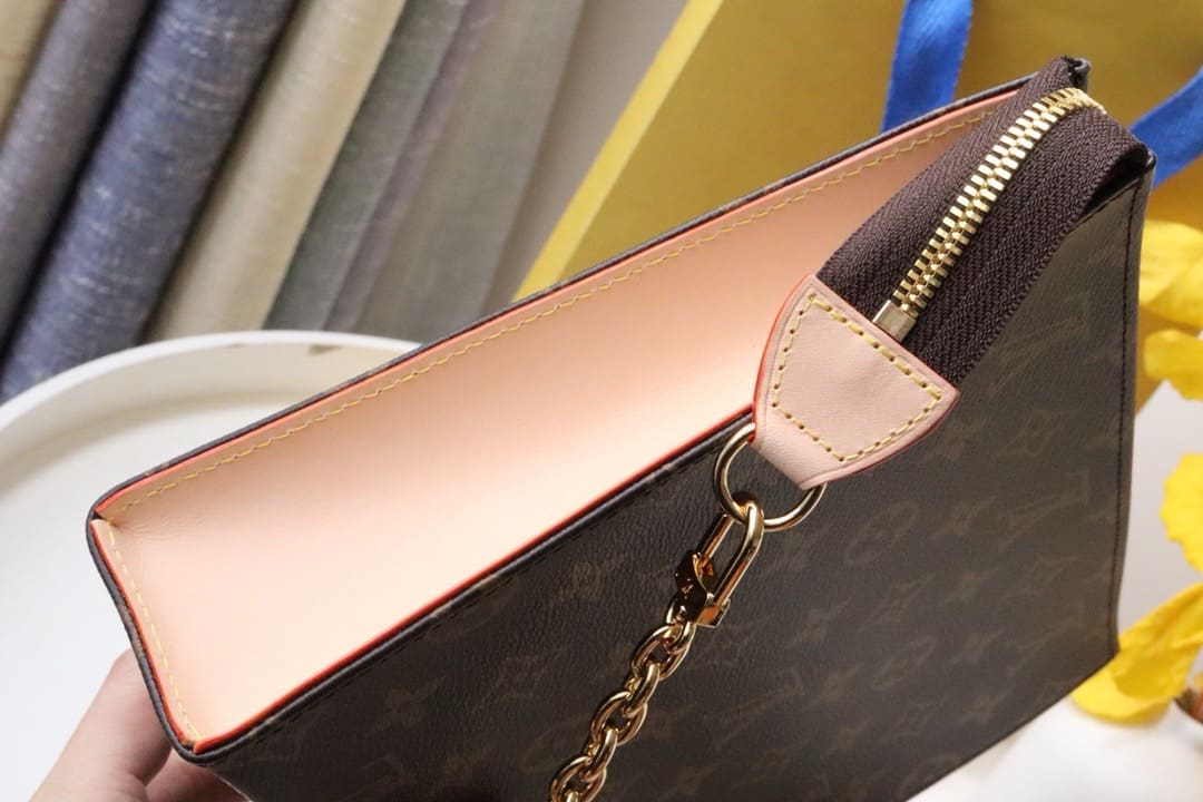The Toiletry Pouch On Chain was inspired by the Monogram Toiletry Pouch cosmetic pouch, created in 1901, which Louis Vuitton clients also used as a clutch. This reworked design adds a removable chain and refined natural leather trim to create a fashionable bag, which can be carried in the hand or on the shoulder. Concealed inside is a smaller version of the pouch, which can also be used separately.