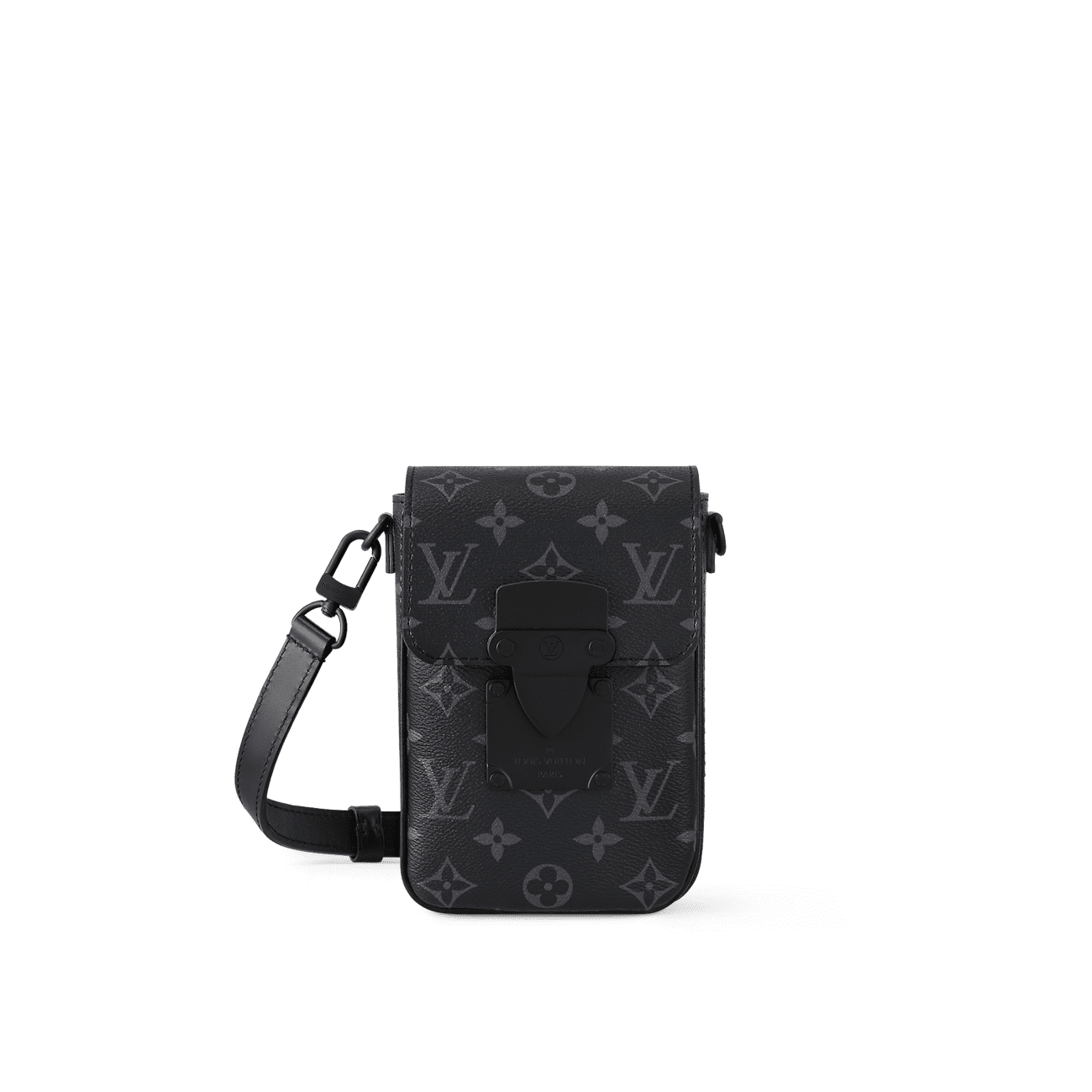 This S-Lock Vertical Wearable Wallet in Monogram Eclipse canvas is a great way to carrying everyday essentials. Inspired by the locks on Louis Vuitton’s historic trunks, the S-lock magnetic closure keeps belongings secure. The removable and adjustable strap enables cross-body and shoulder carry. Inside there’s a special compartment for a smartphone.